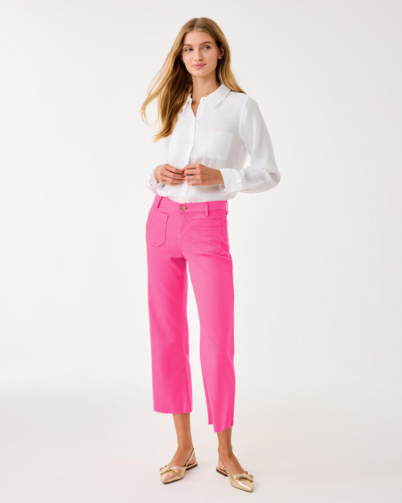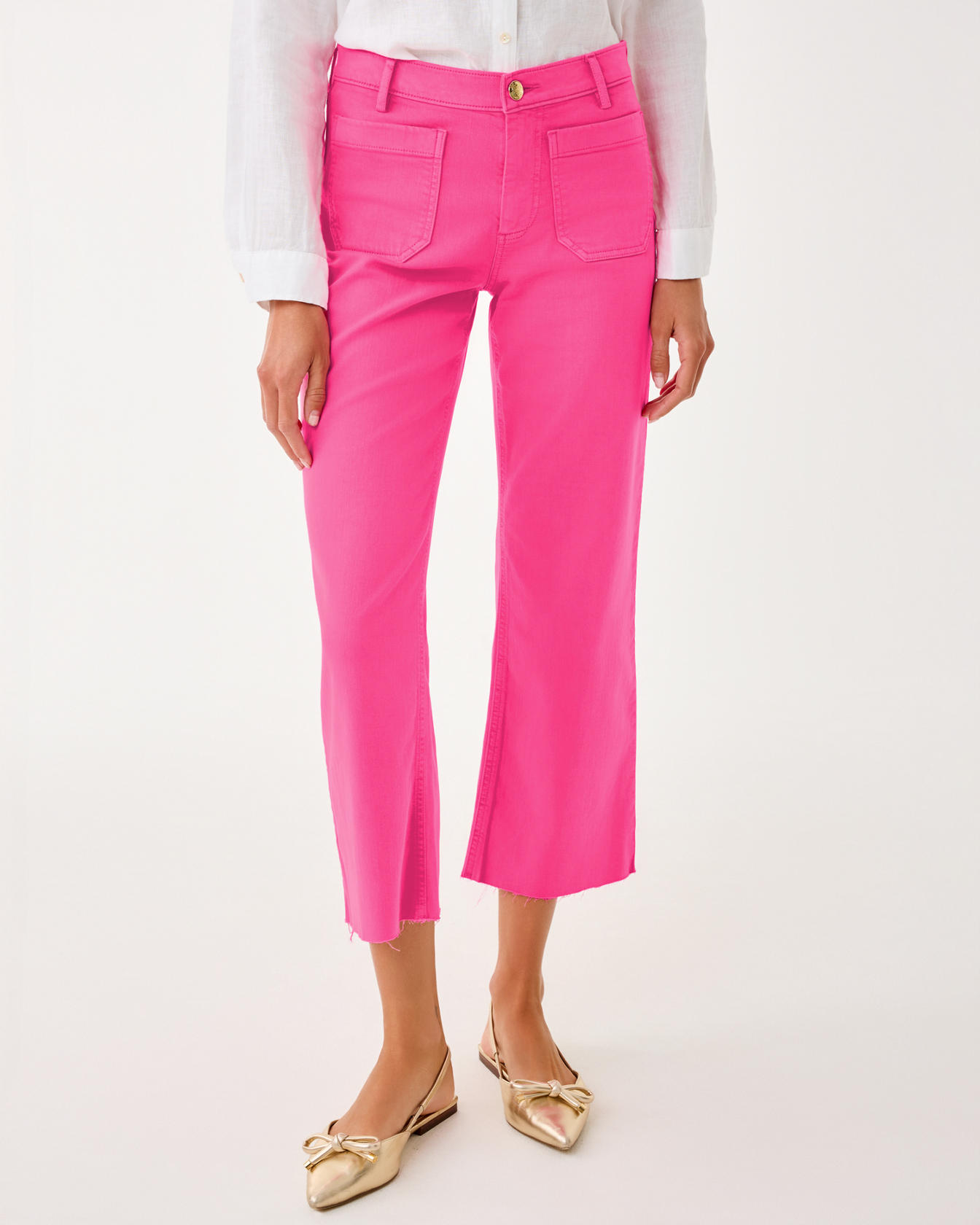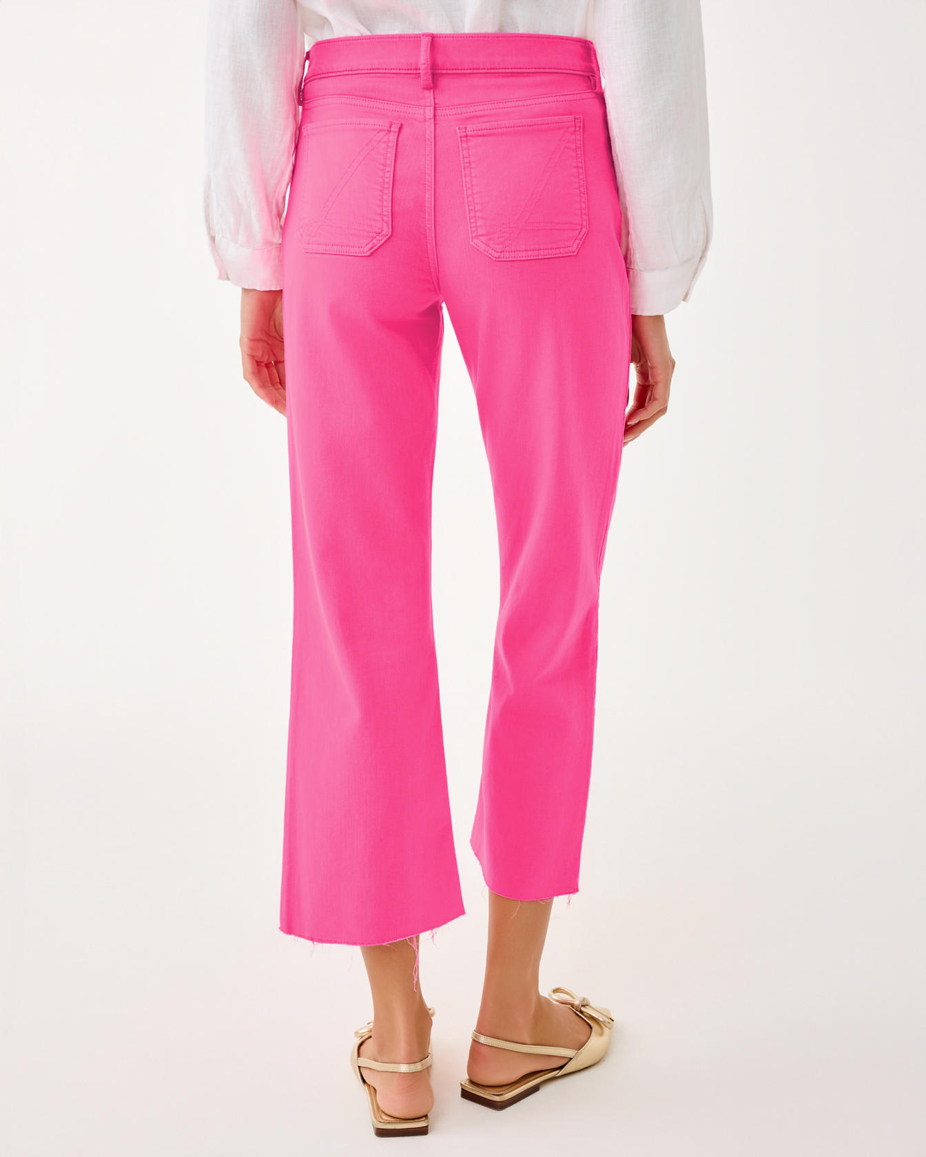 • High rise, straight fit, crop flare jean.