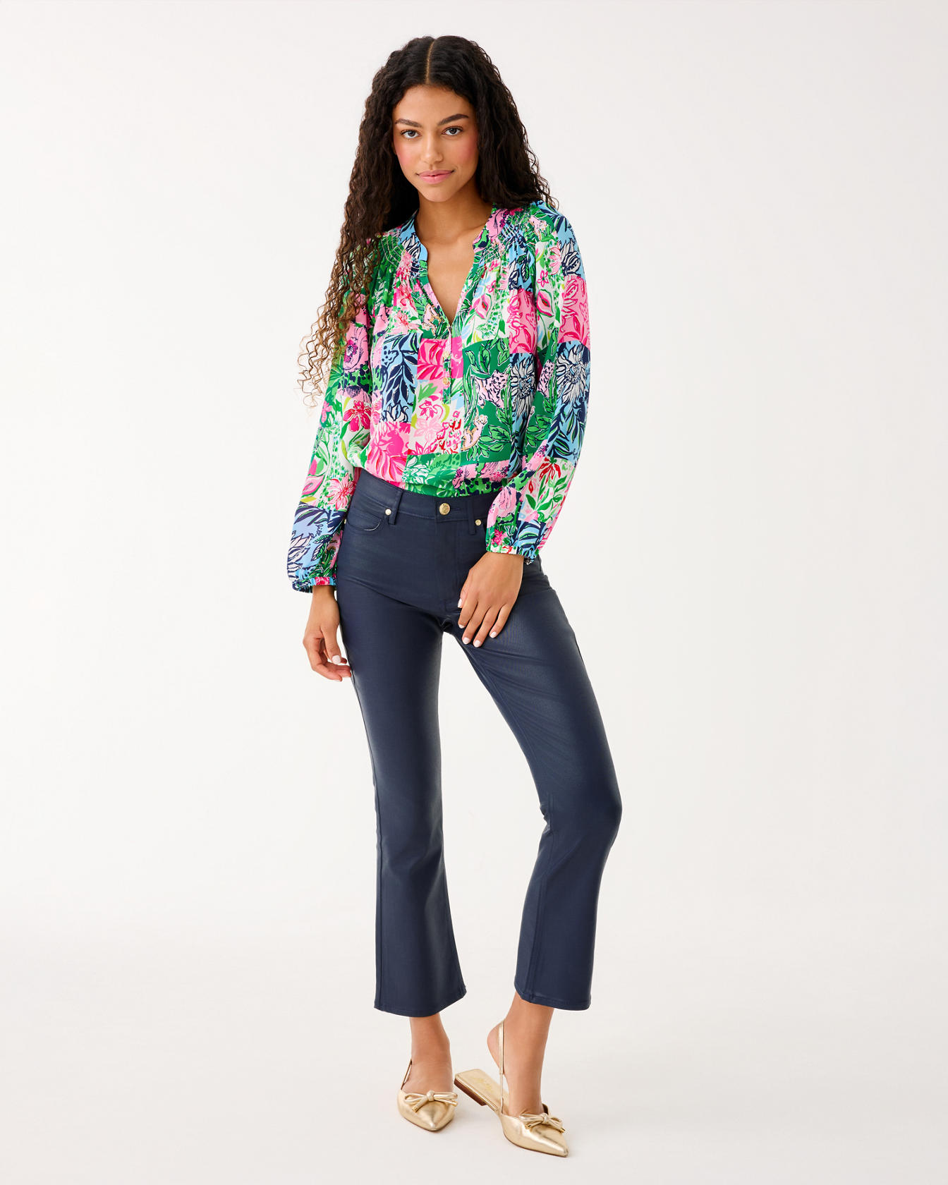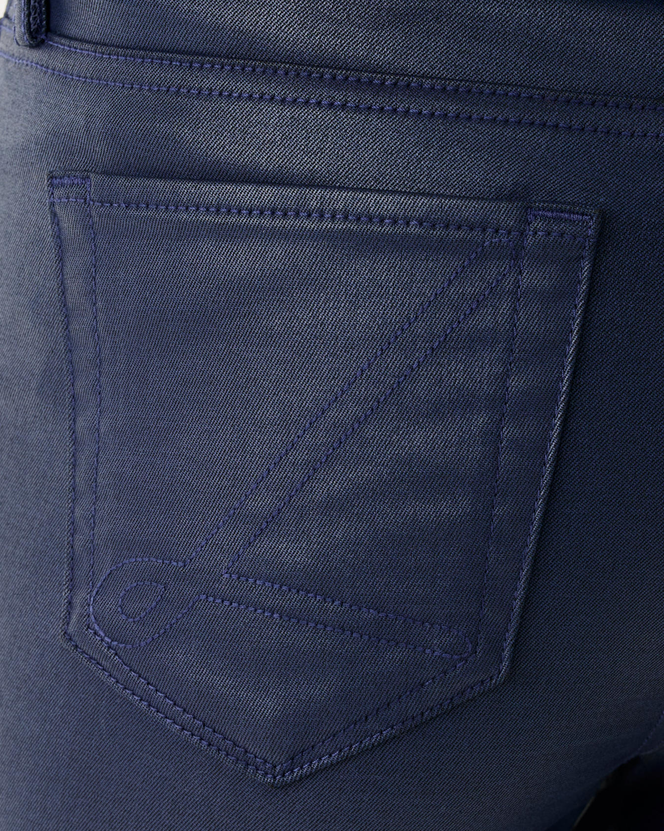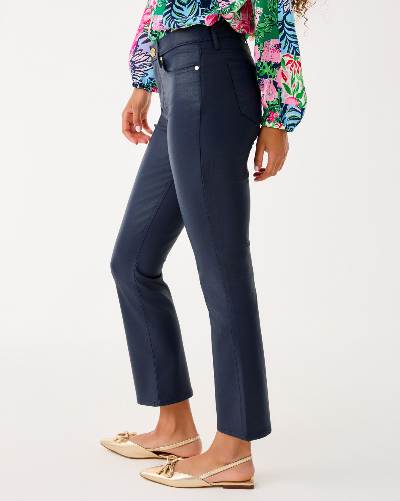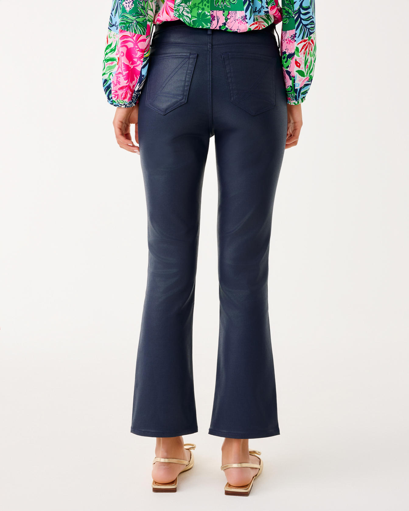 - High rise, crop flare, coated denim jean with a straight fit and front fly.