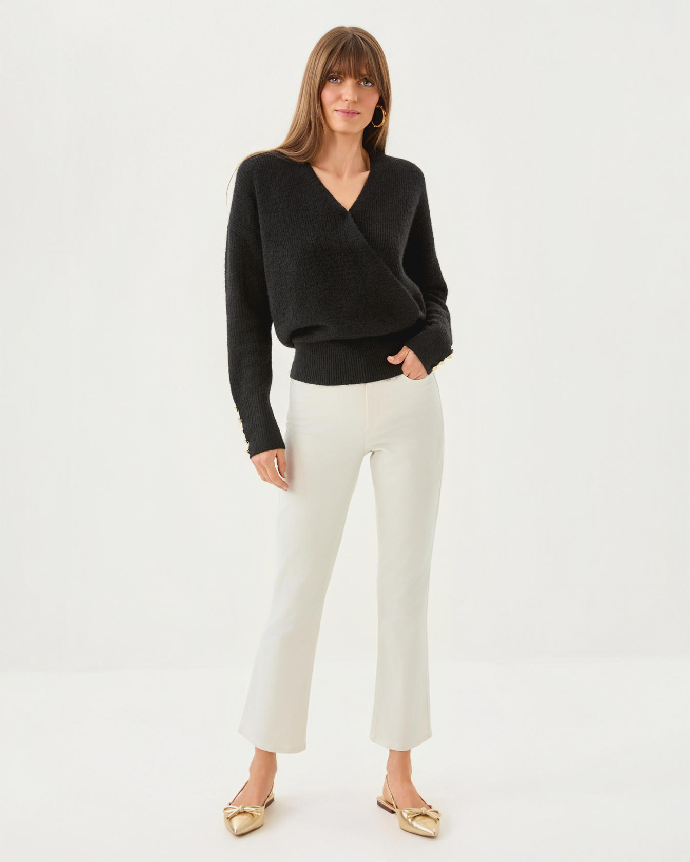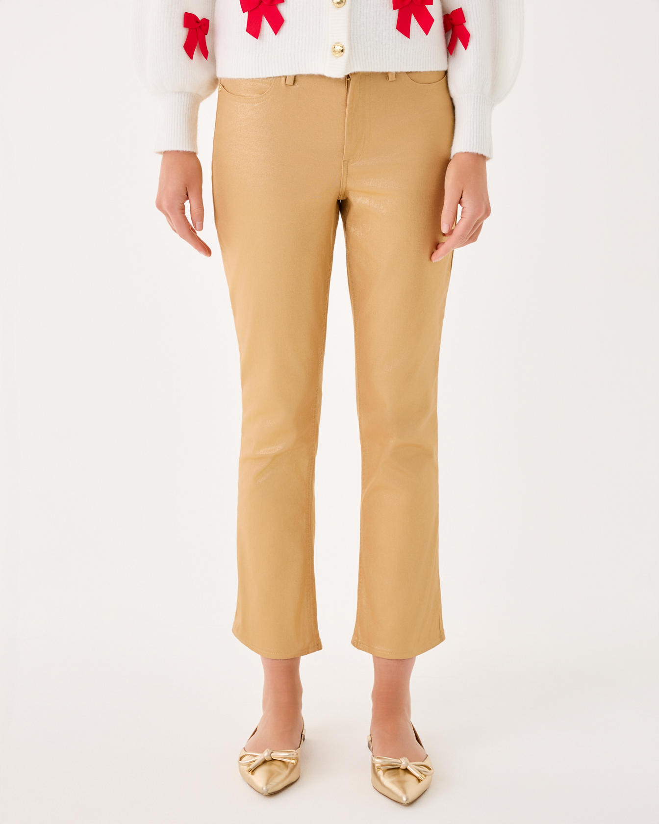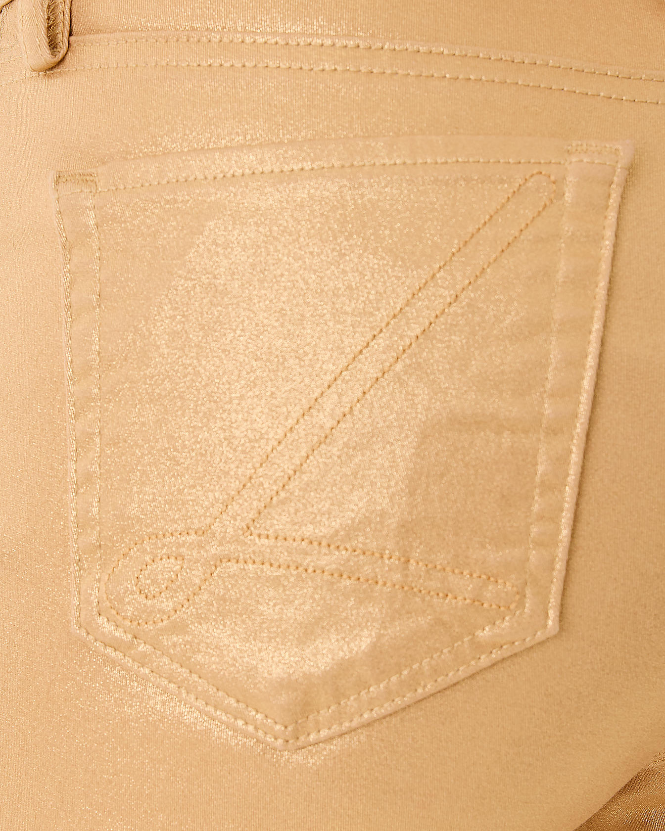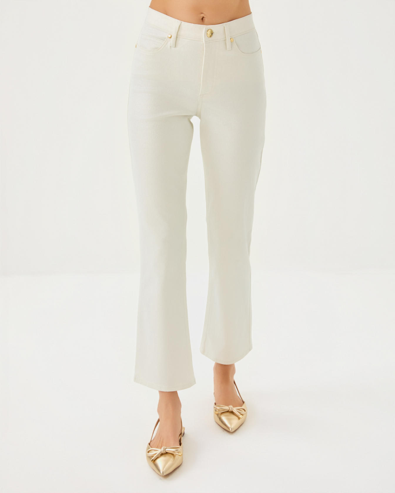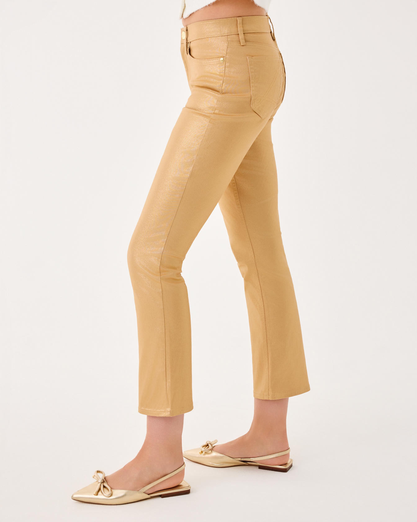 - High rise, crop flare, stretch coated denim jean with a straight fit.