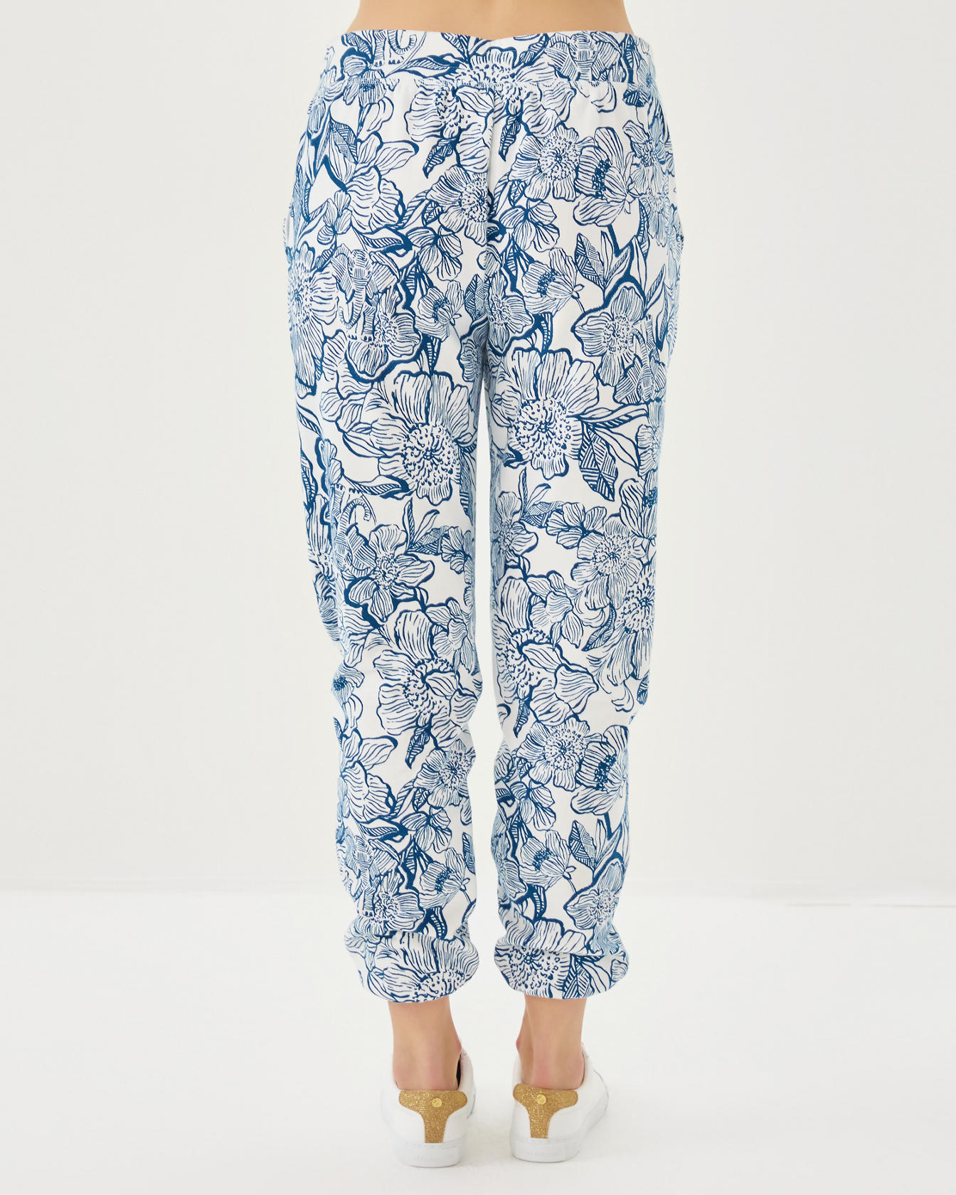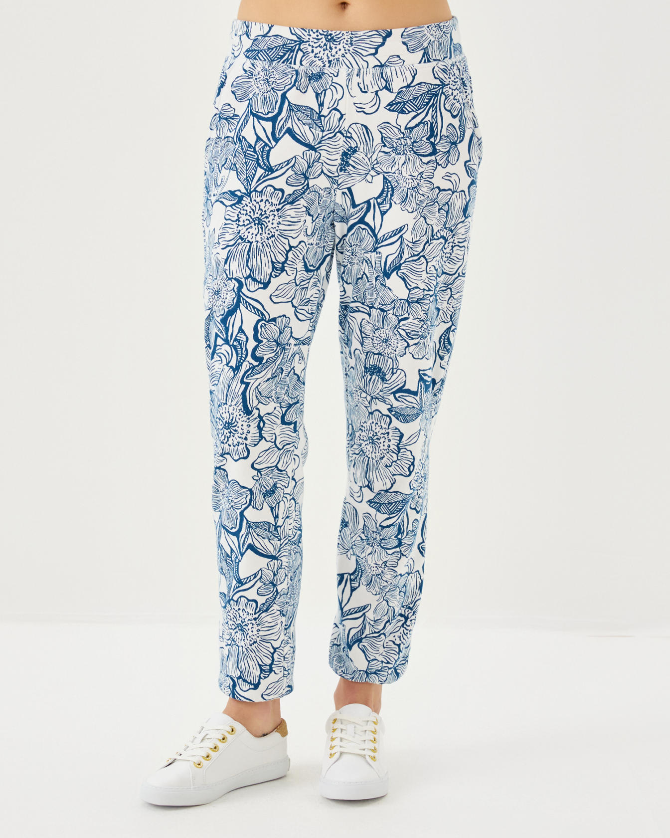 - Mid-rise, relaxed fit, pull-on pant with front pockets.