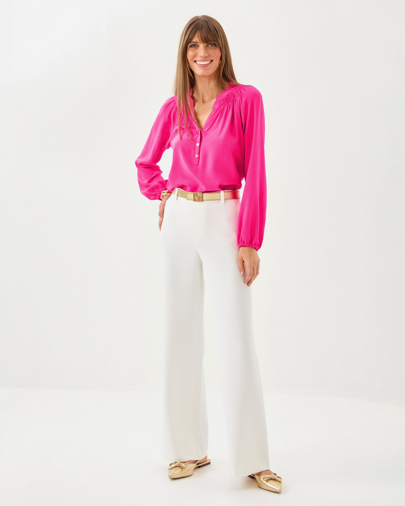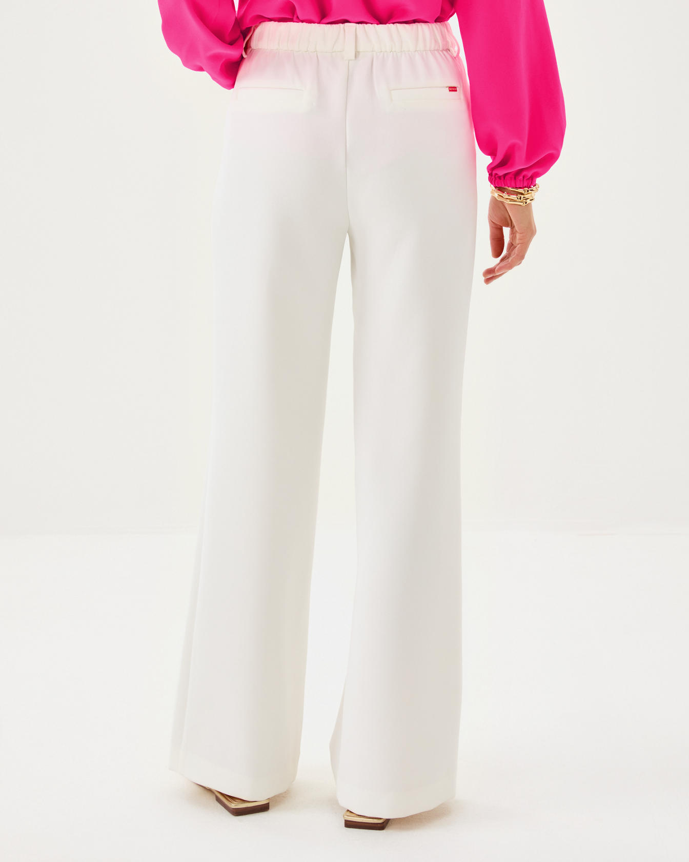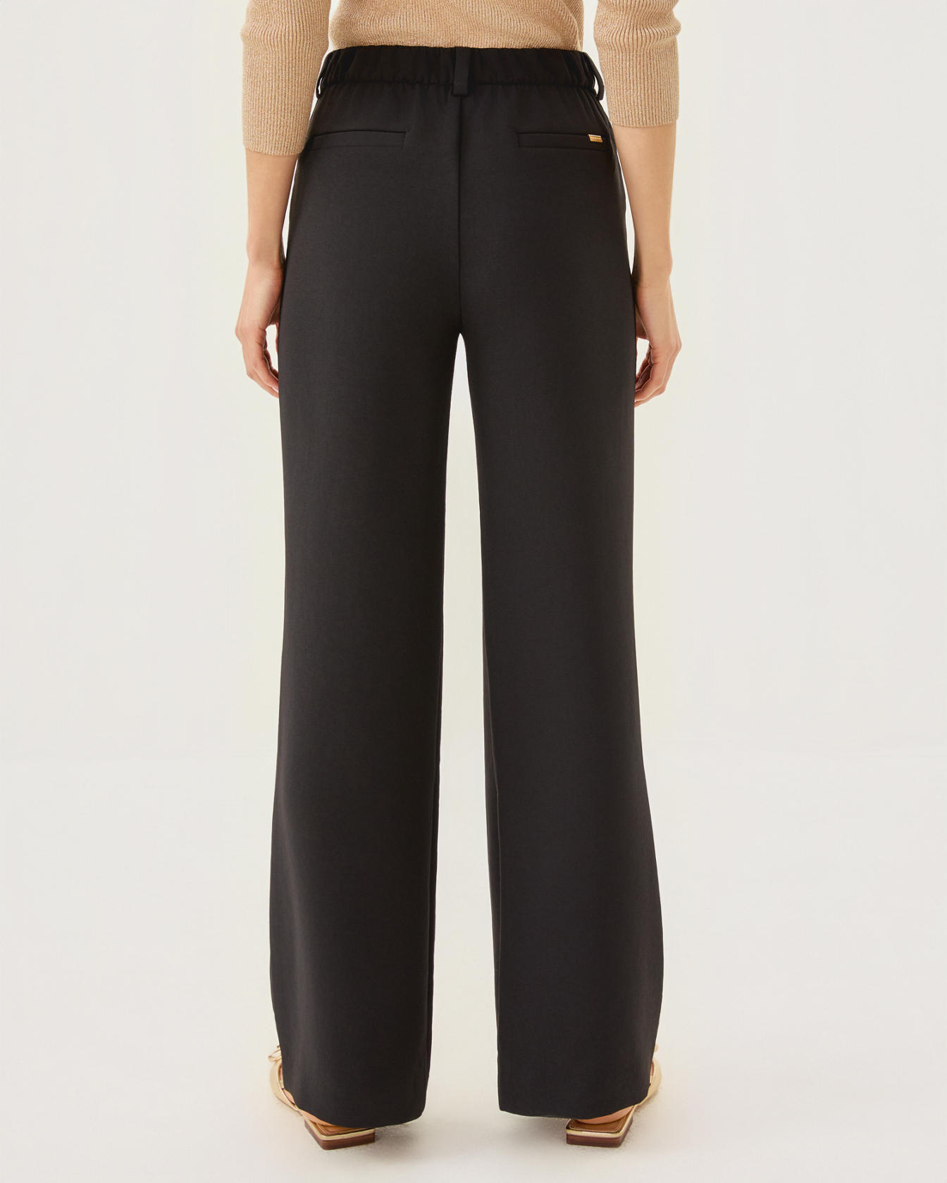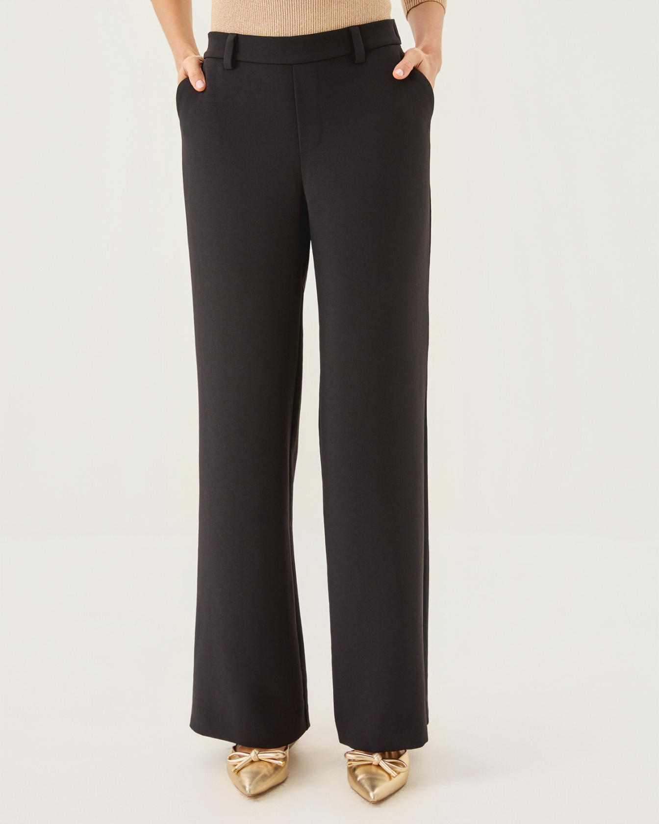 • High rise, pull-on, crepe palazzo pant with a wide fit. Wrinkle resistant.