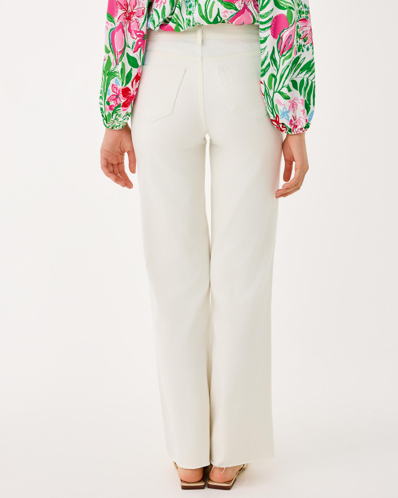 - High rise, straight fit, denim jean. Raw hem designed for you to cut to your custom length.