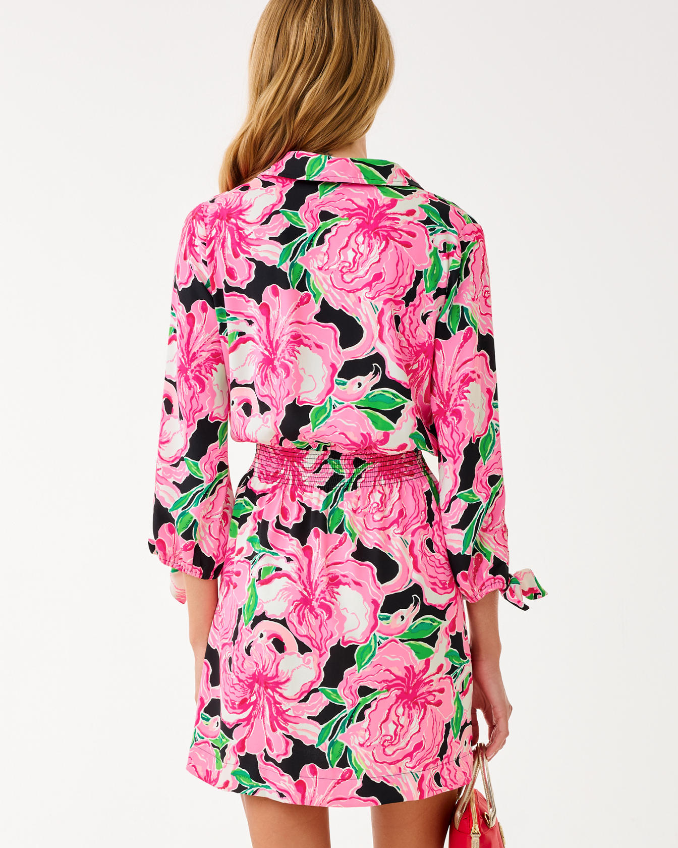 • Easy fit, collared shirtdress with a smocked waist and 3/4 length sleeves with tie details.