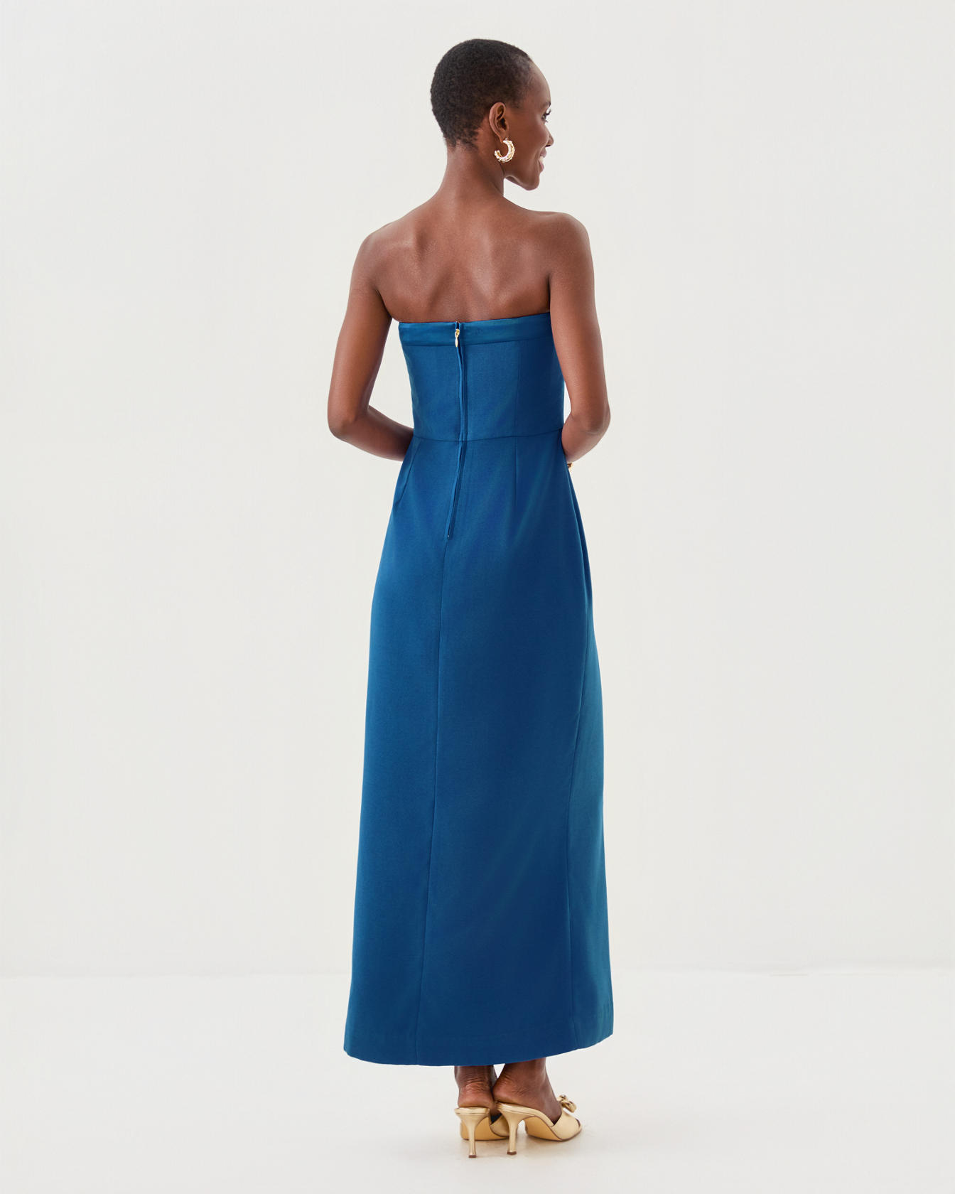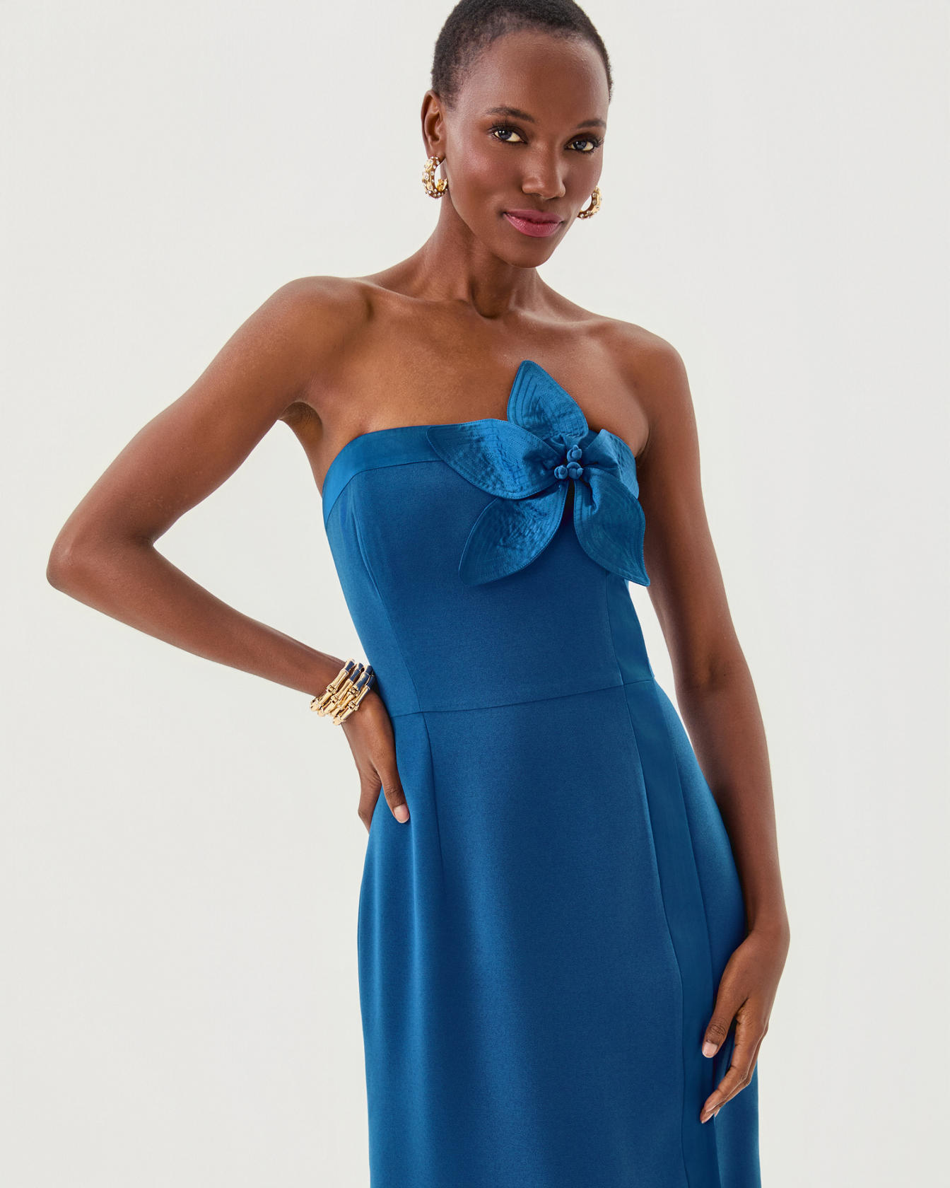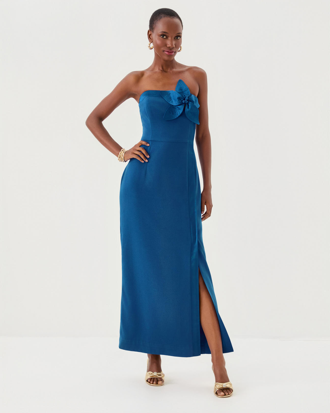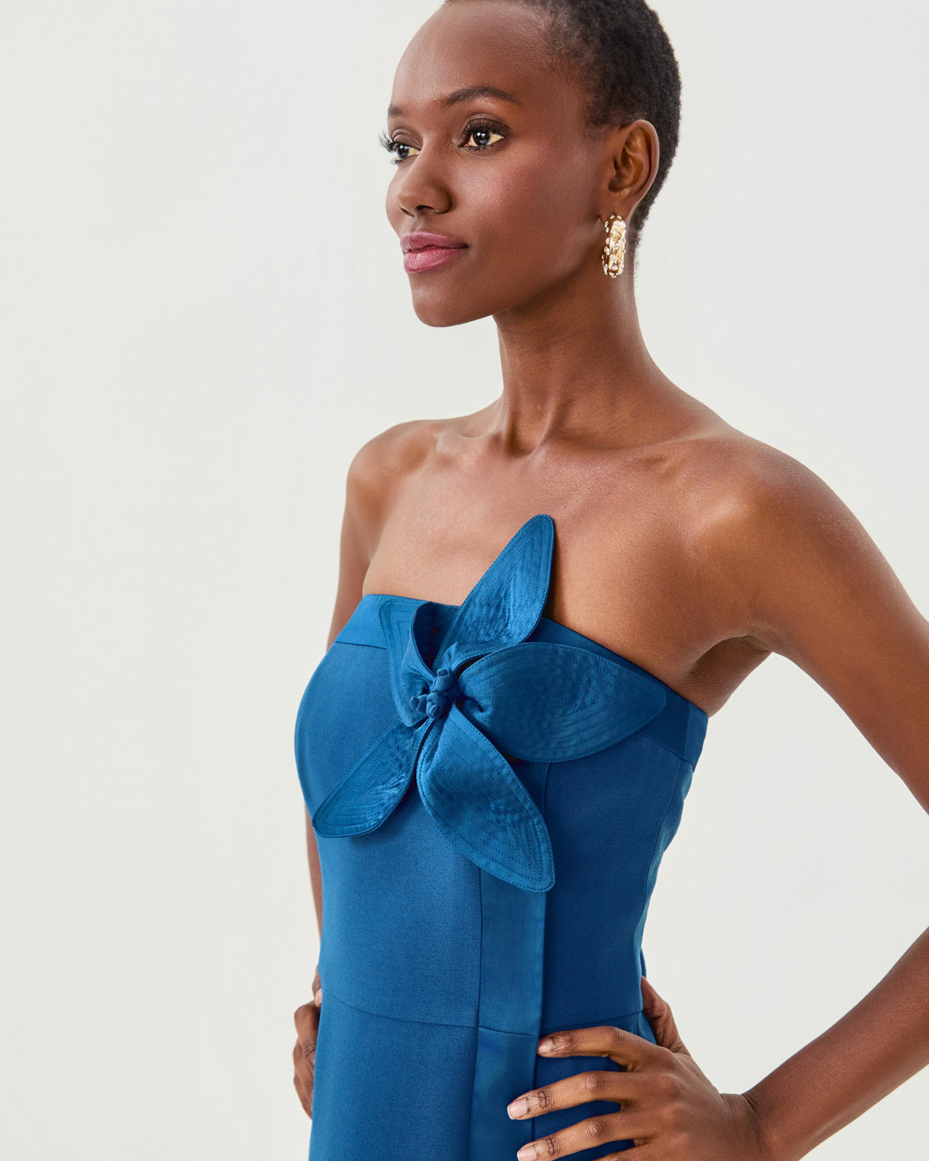 • Fitted, strapless maxi dress with an interior corset, front slit, and a large floral applique at the neckline.