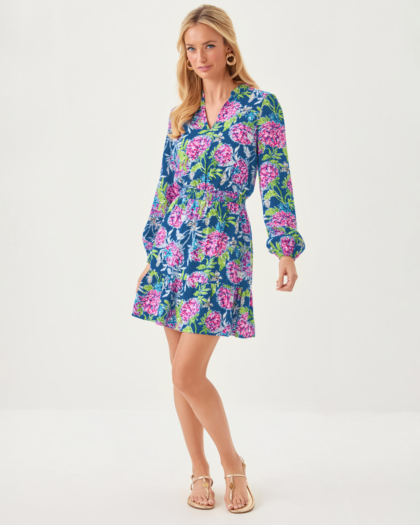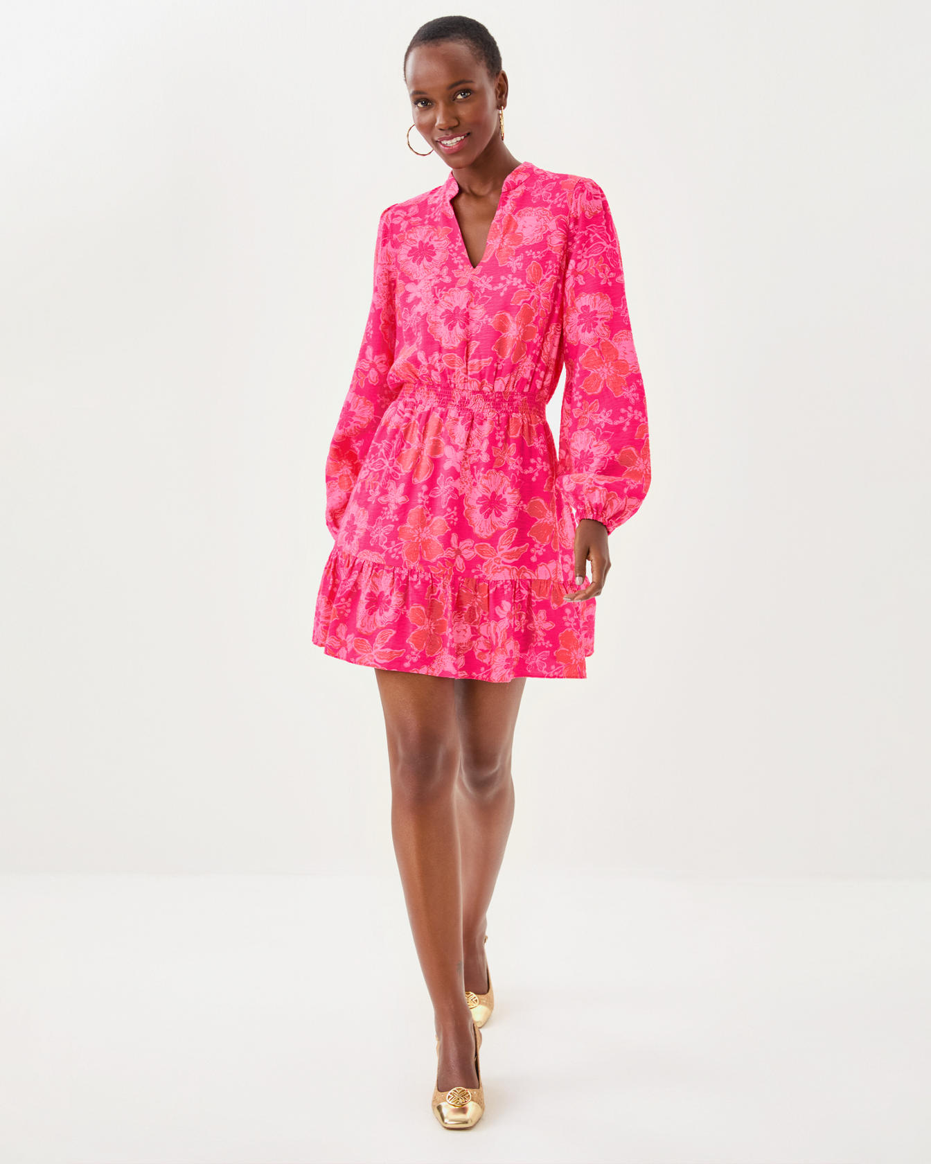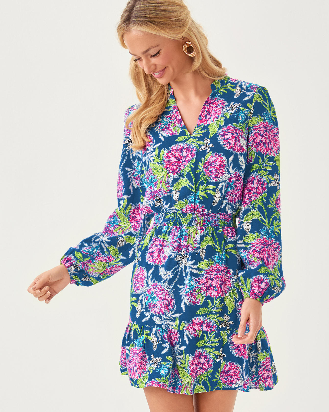 - Easy fit, notch neck dress with a stand collar, smocked waist, long sleeves, and a hem ruffle.
