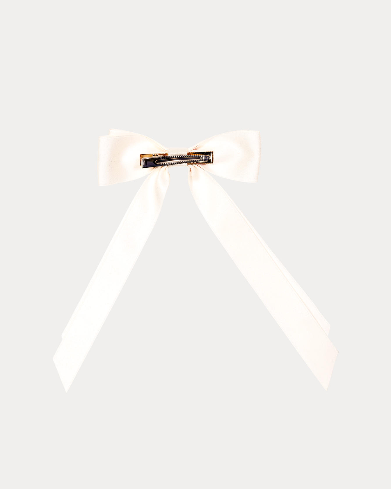• Bow hair clip with cascading ribbons and a gold logo emblem.