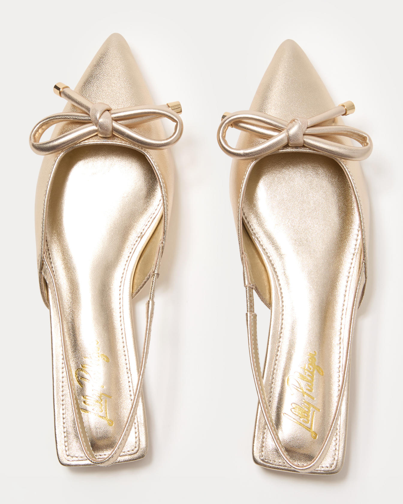 - Pointed toe, slingback shoe with a bow detail, square stacked wooden heel, and a plush padded footbed.