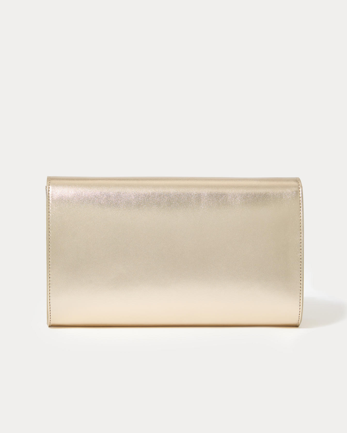 - Gold clutch with Lilly logo hardware, printed lining, and a detachable gold metal chain crossbody strap.