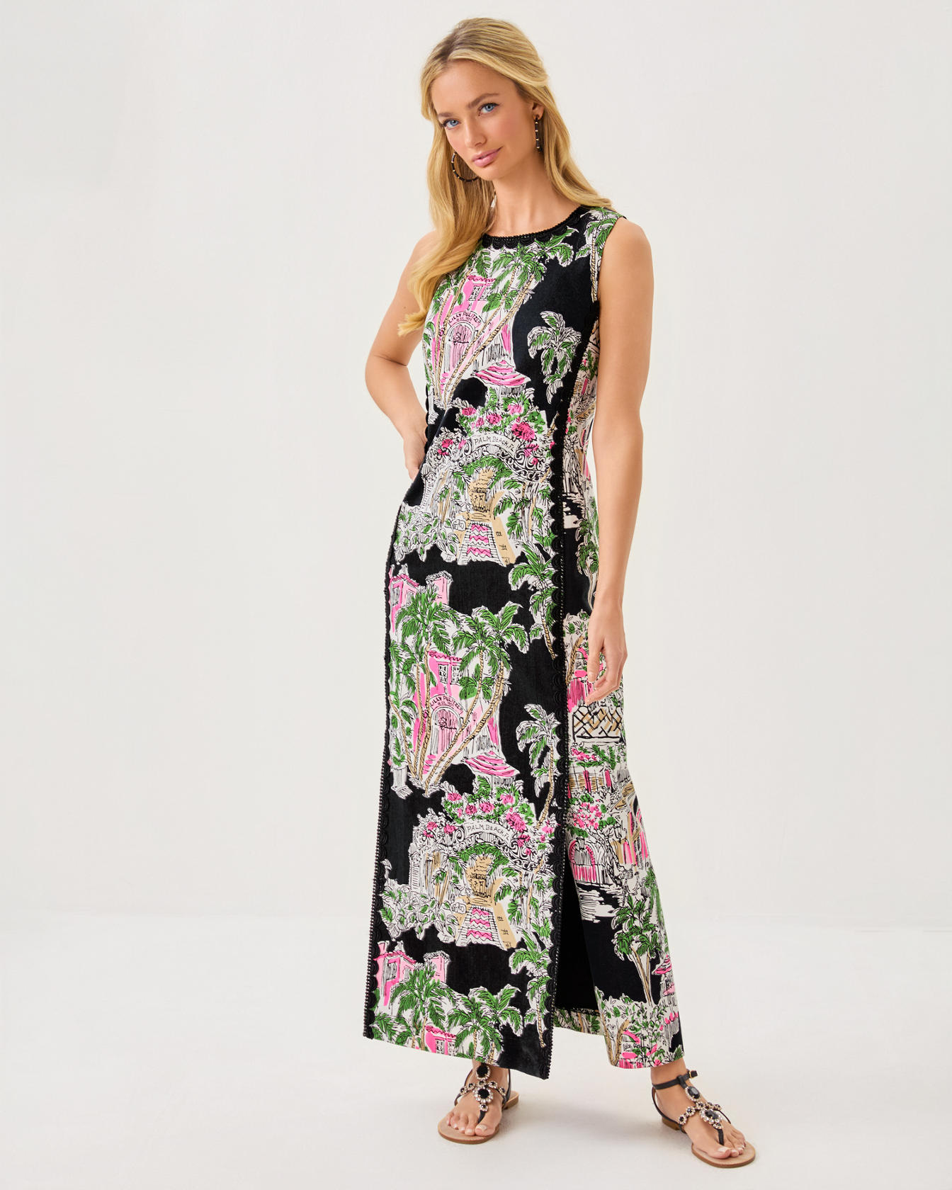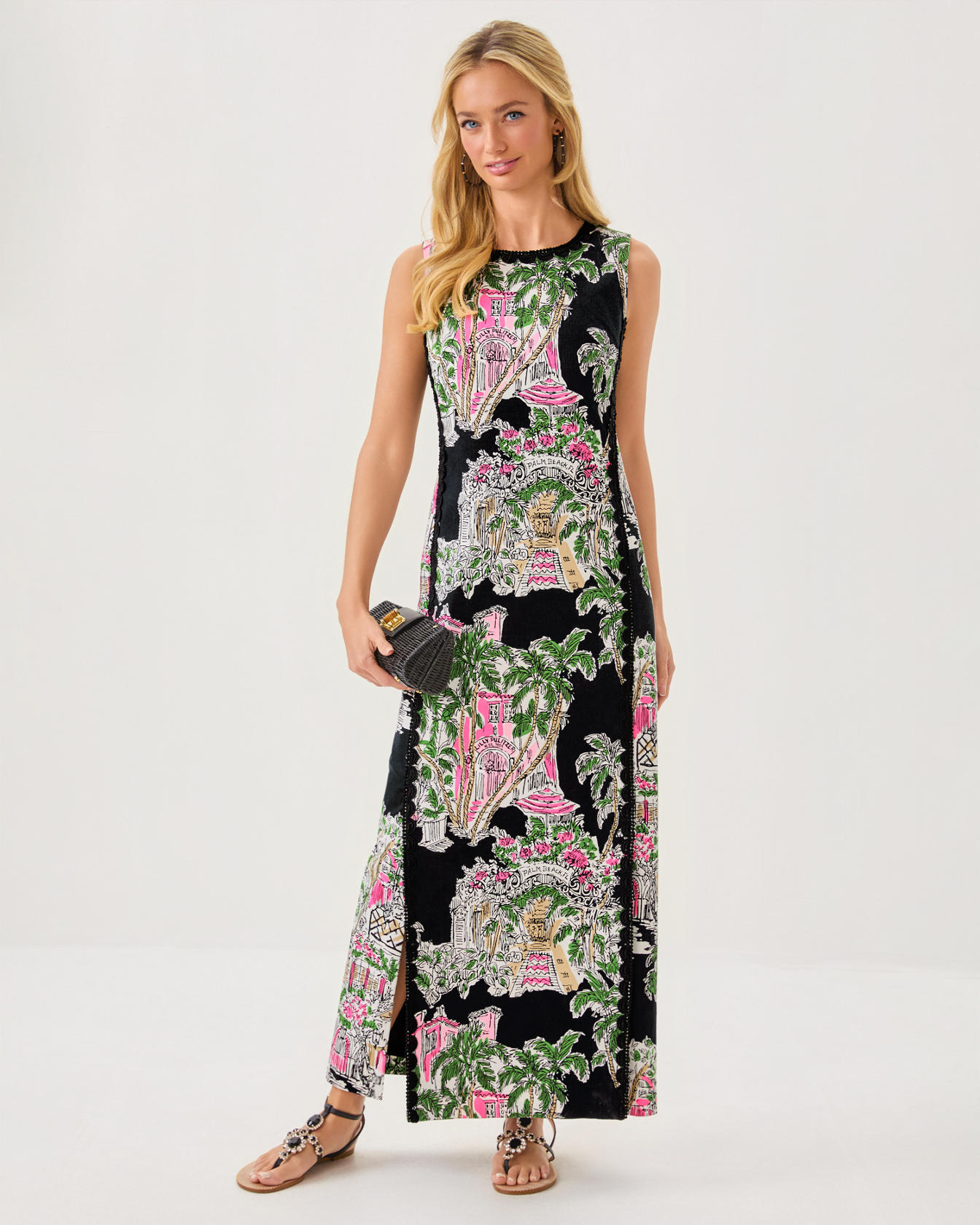 - Straight fit, crew neck, maxi shift dress with a side panel detail, front skirt vents, and Lilly lace trim.