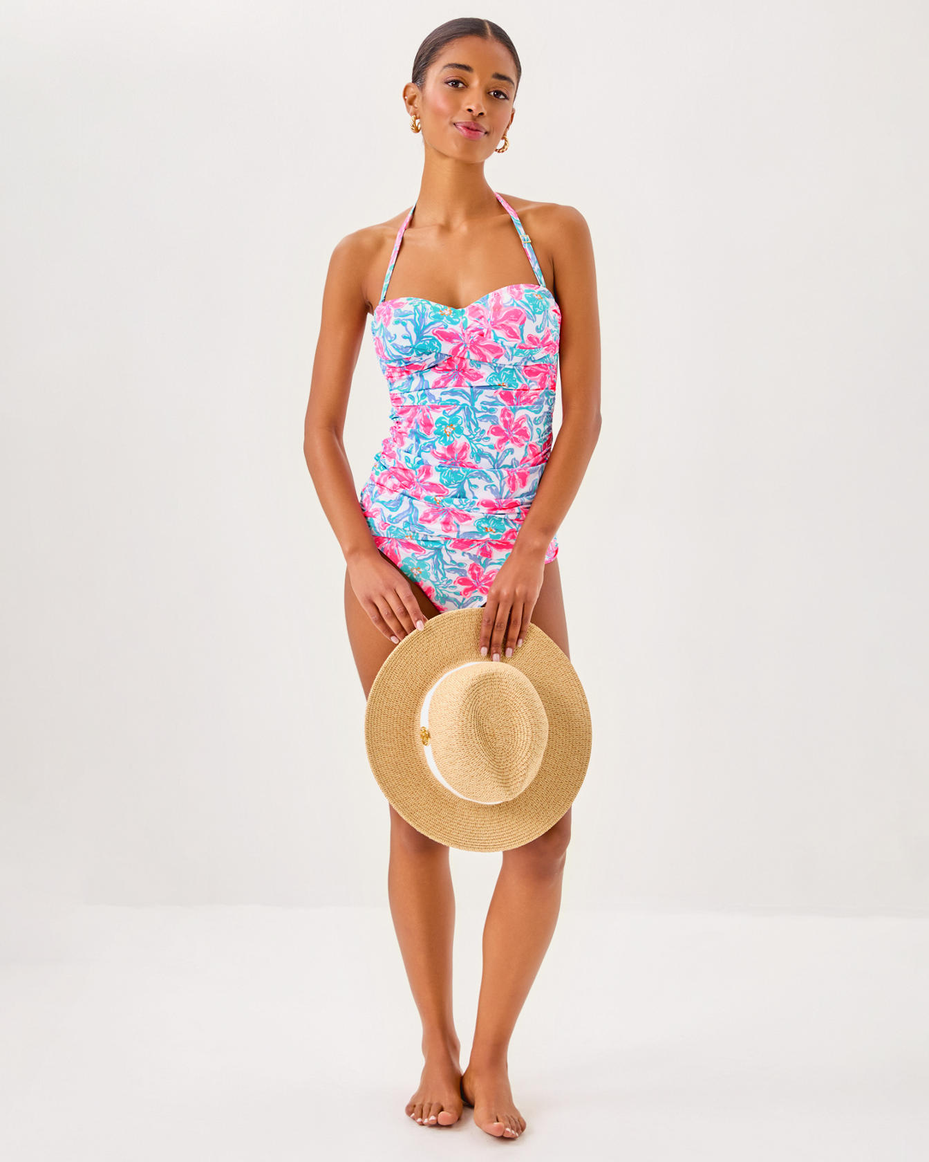 • Features a classic bandeau maillot, soft molded cups, waist shirring to camouflage and conceal, and a high back for support.