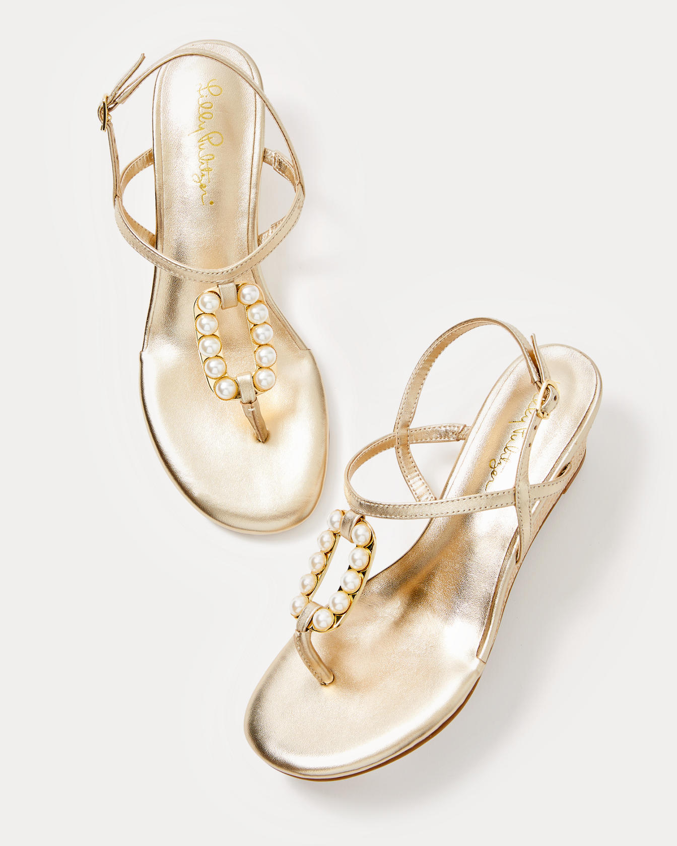 - T-strap sandal with a straw wrapped wedge, pearl embellished hardware, and padded footbed.