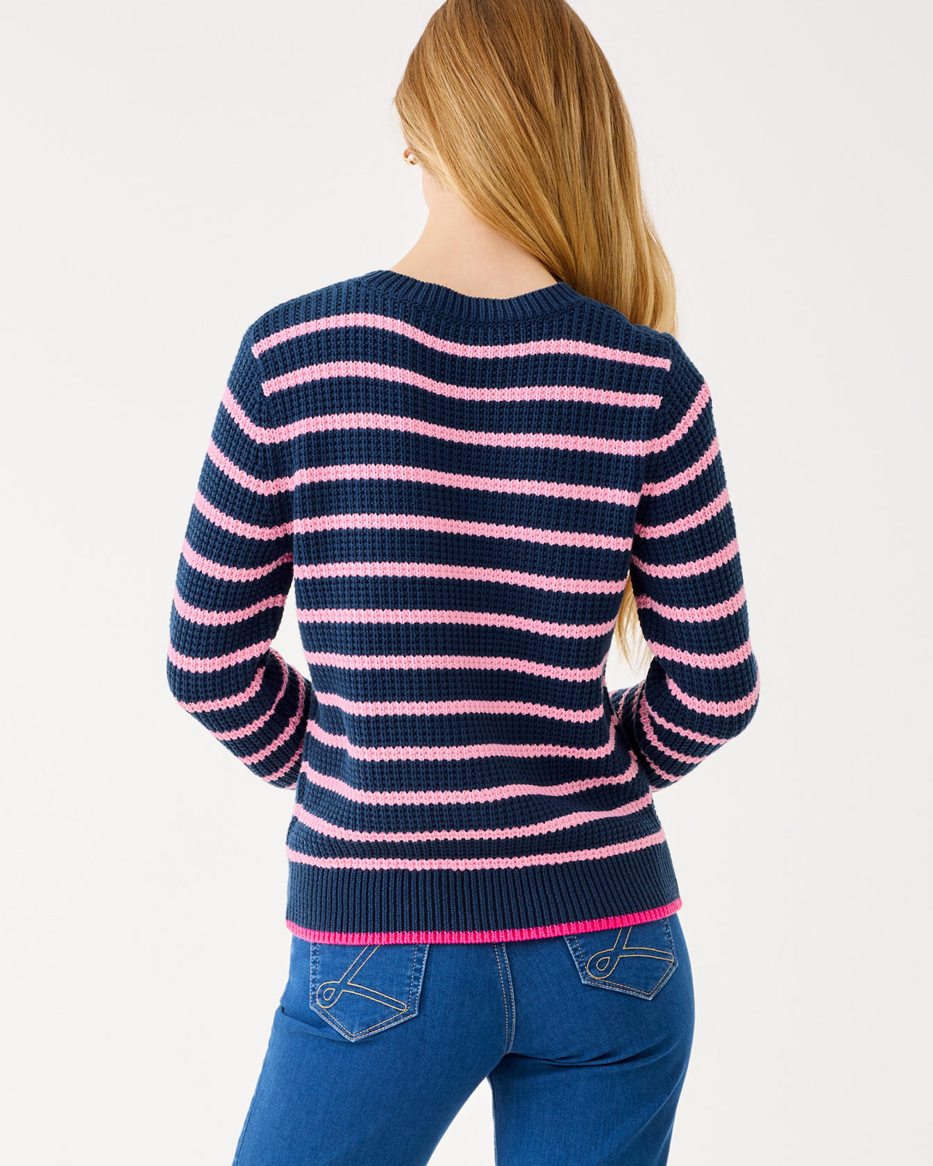 • Straight fit, long sleeve, crew neck pullover with a novelty crochet motif and contrast tipping.