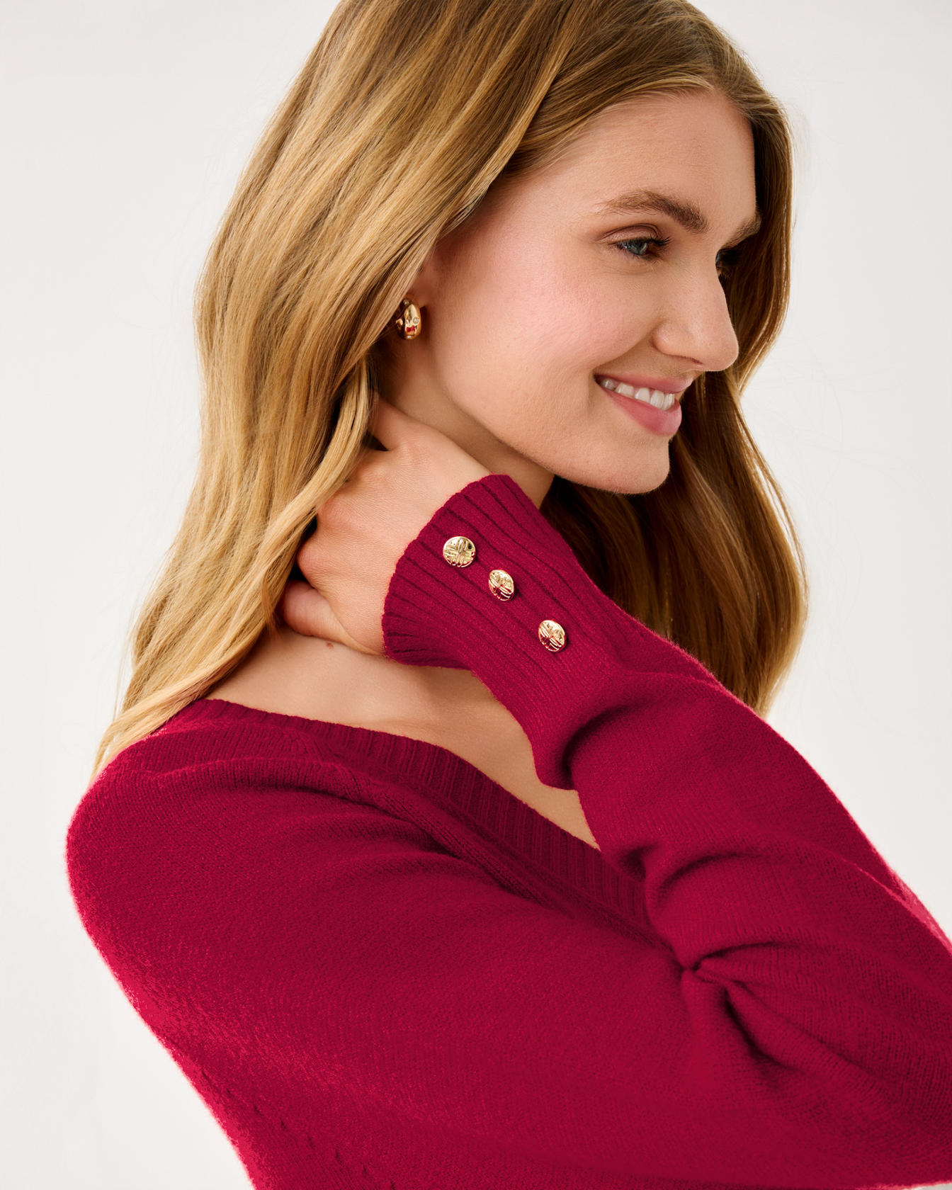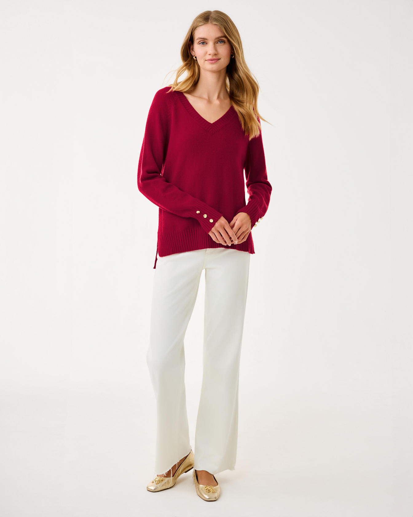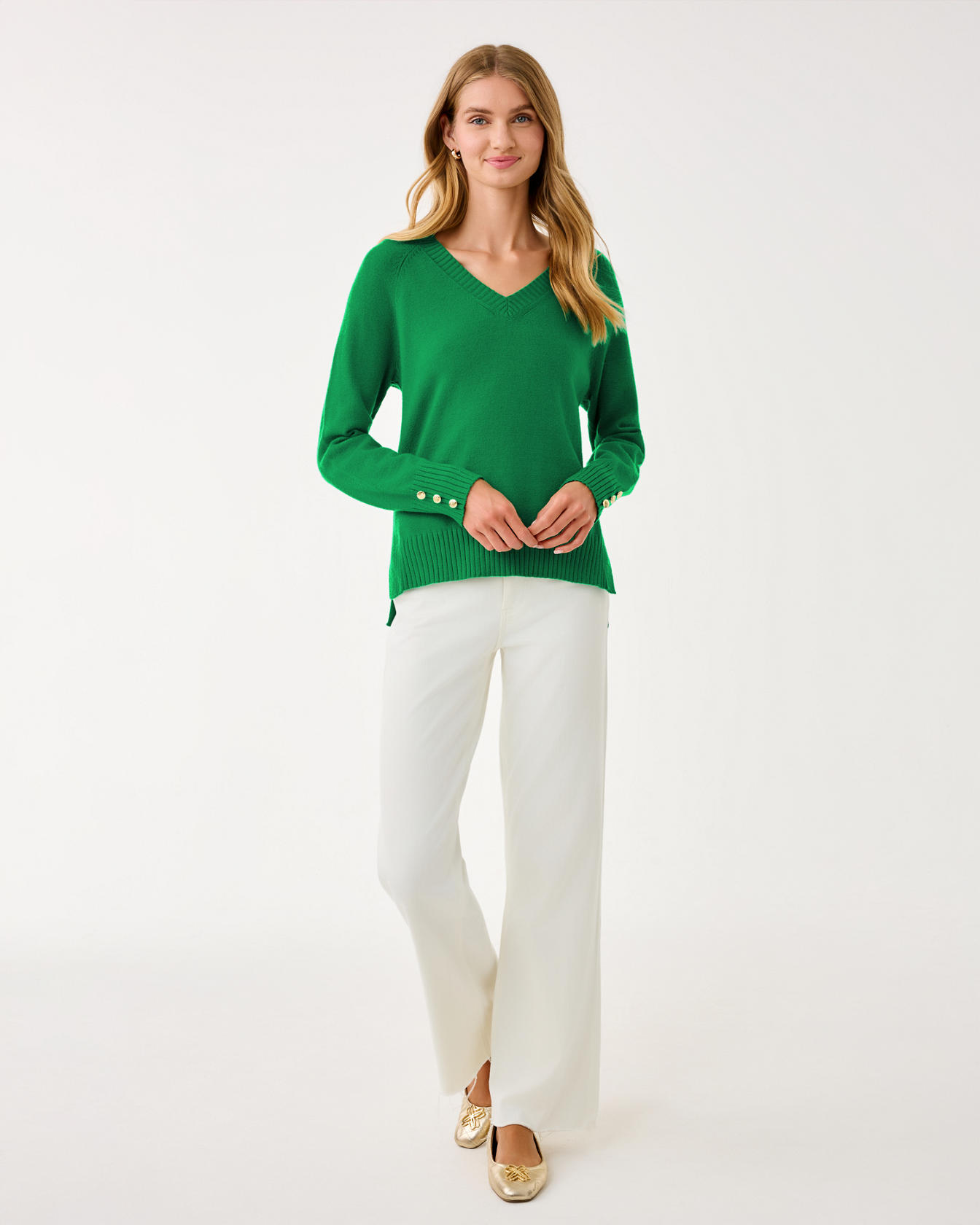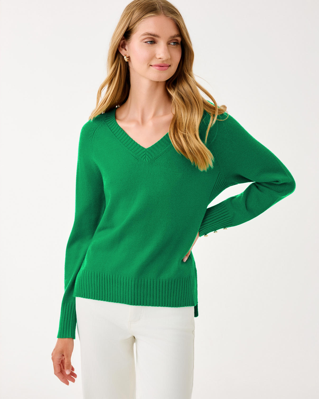- Easy fit, v-neck sweater with a stepped hem, raglan sleeves, side slits, and buttons at the cuff.