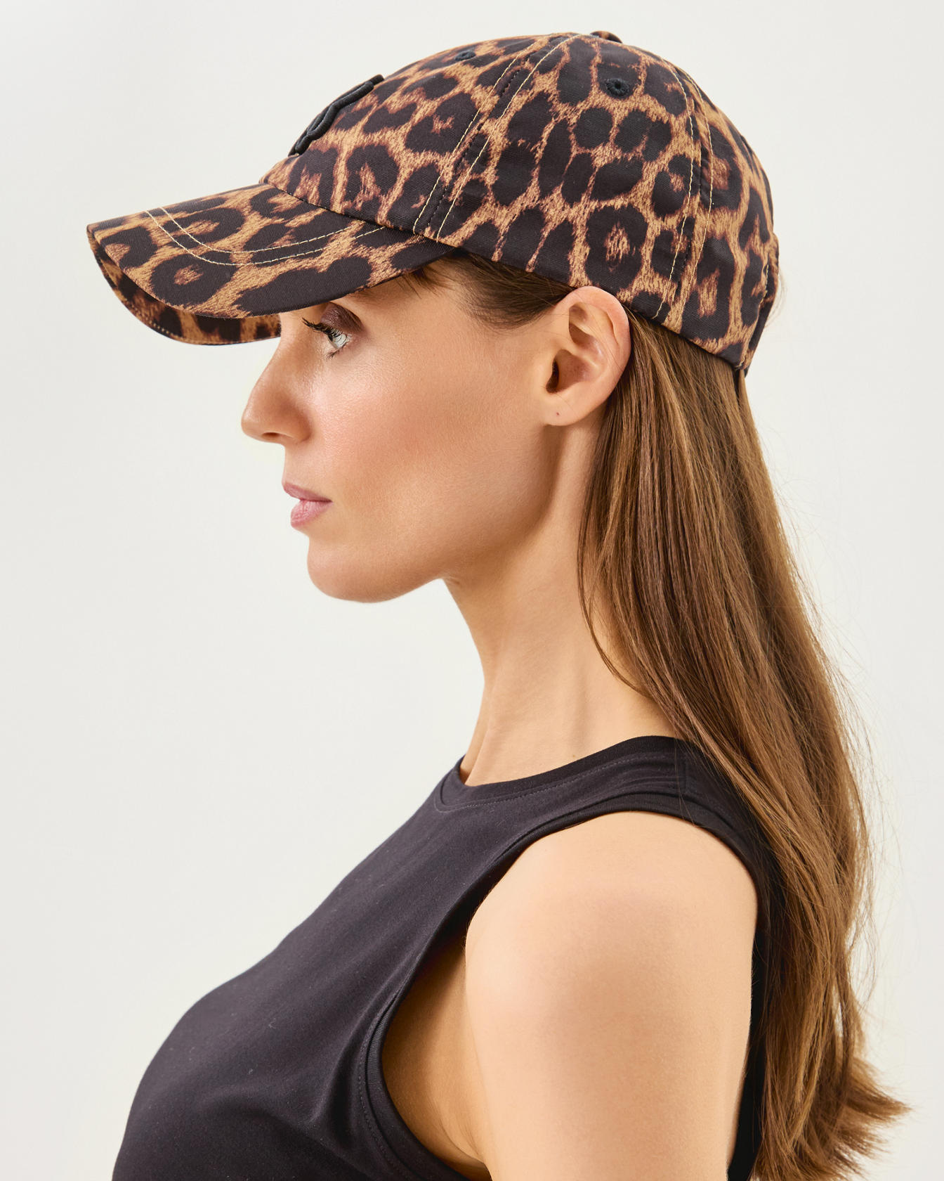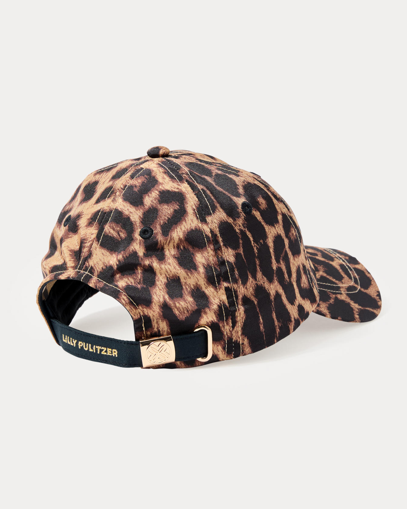 - Printed baseball hat with an embroidered logo mark and an adjustable metal buckle for fit.