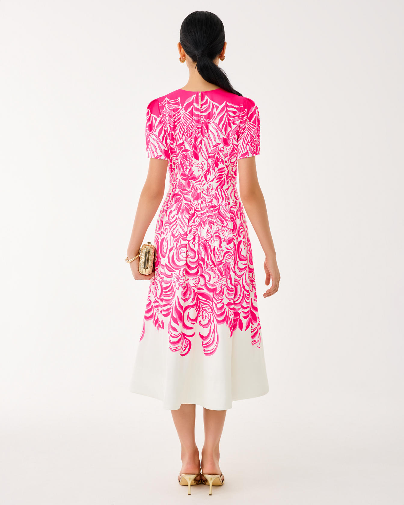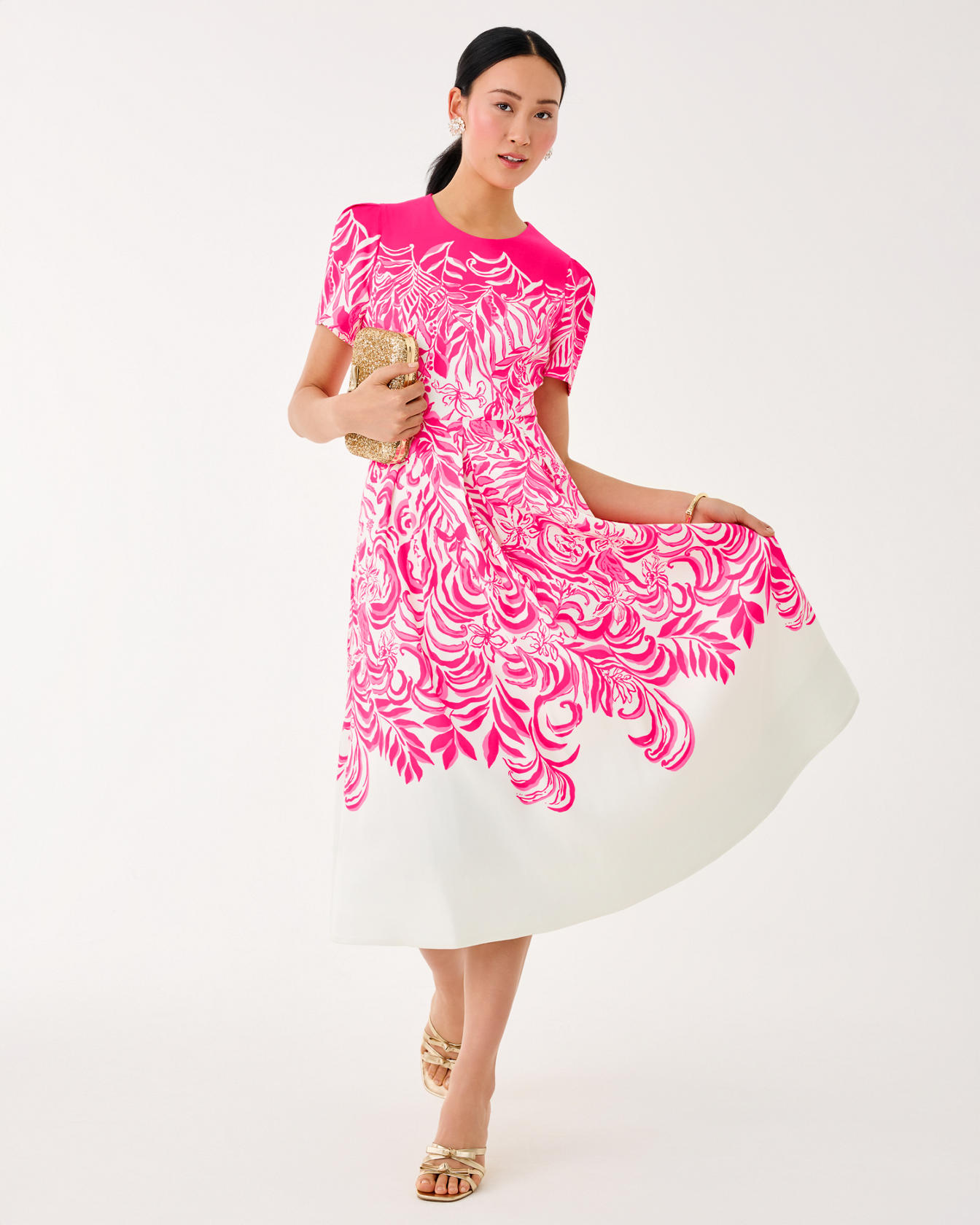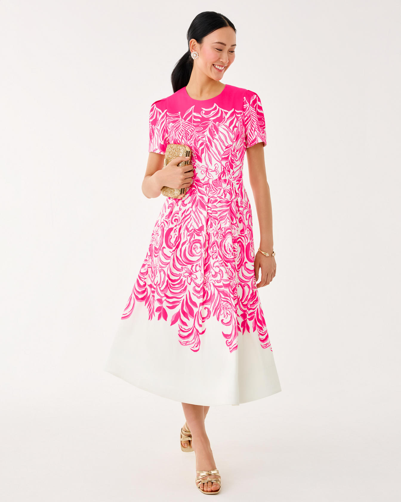- Fit-and-flare dress with short sleeves, a pleated skirt, and side seam pockets.