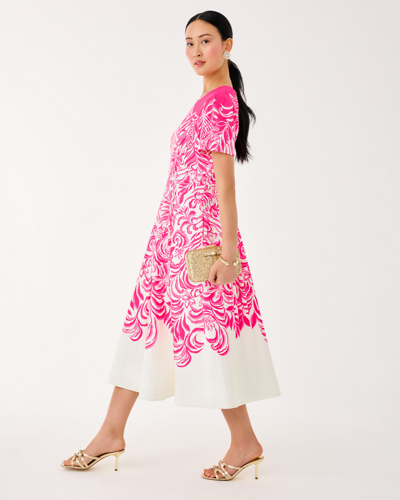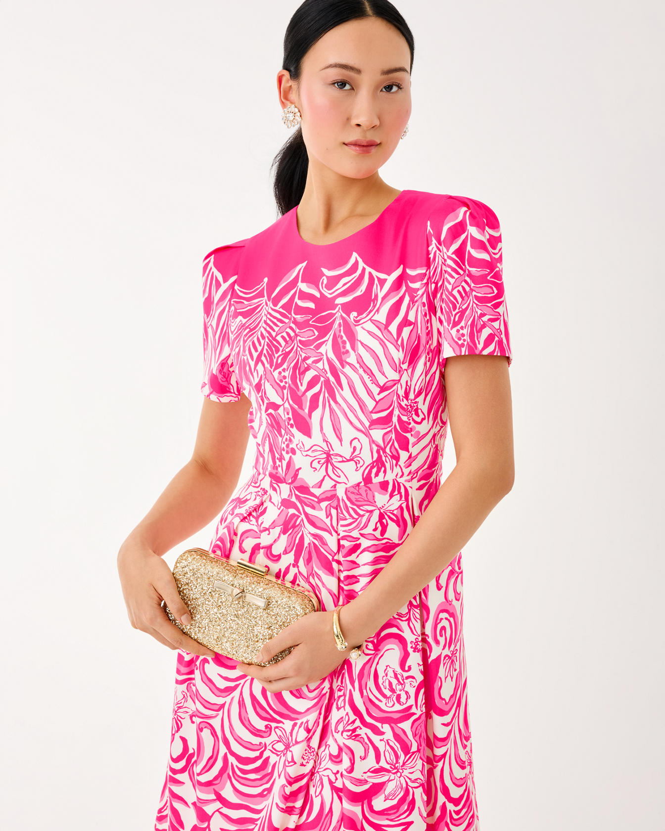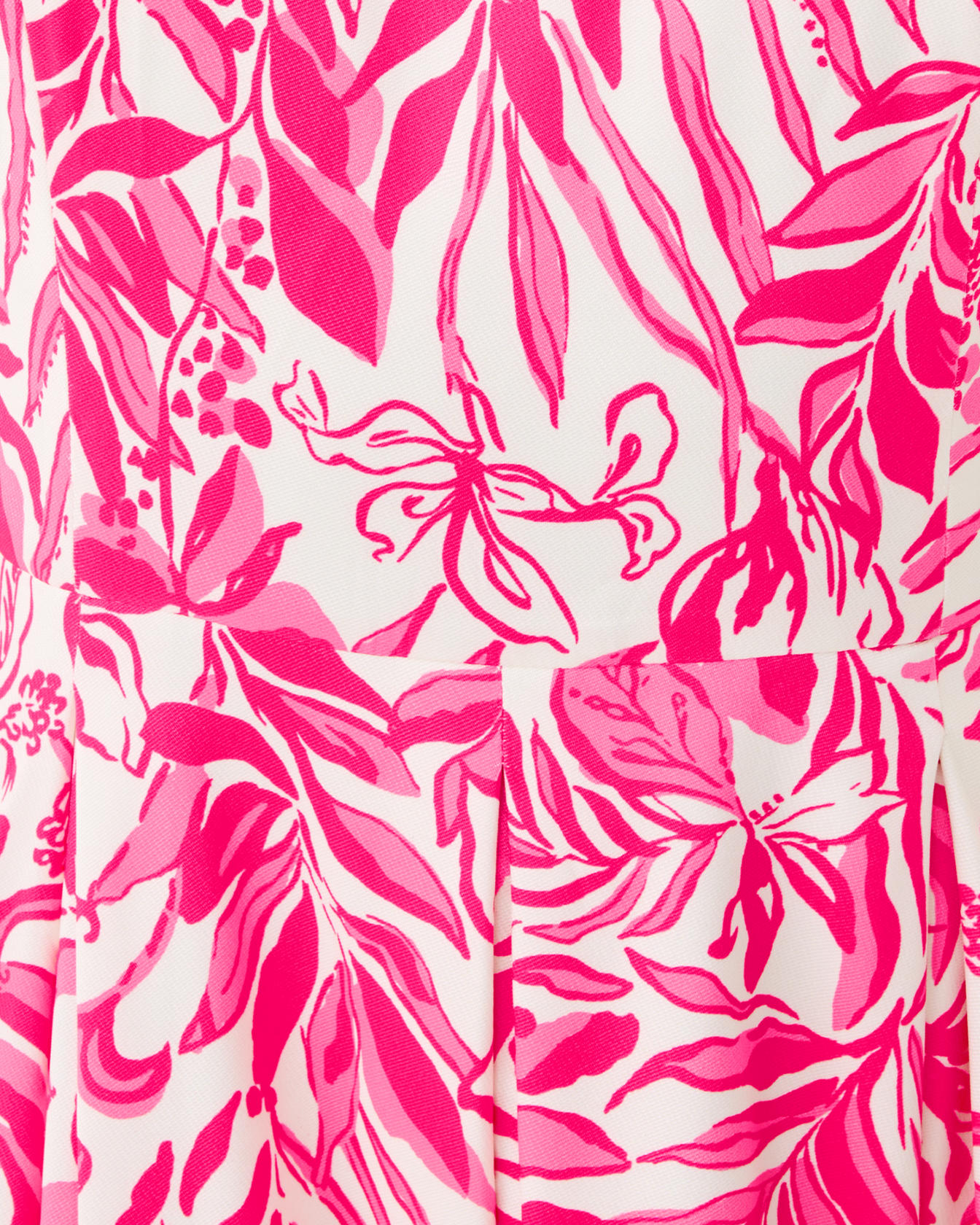 - Fit-and-flare dress with short sleeves, a pleated skirt, and side seam pockets.