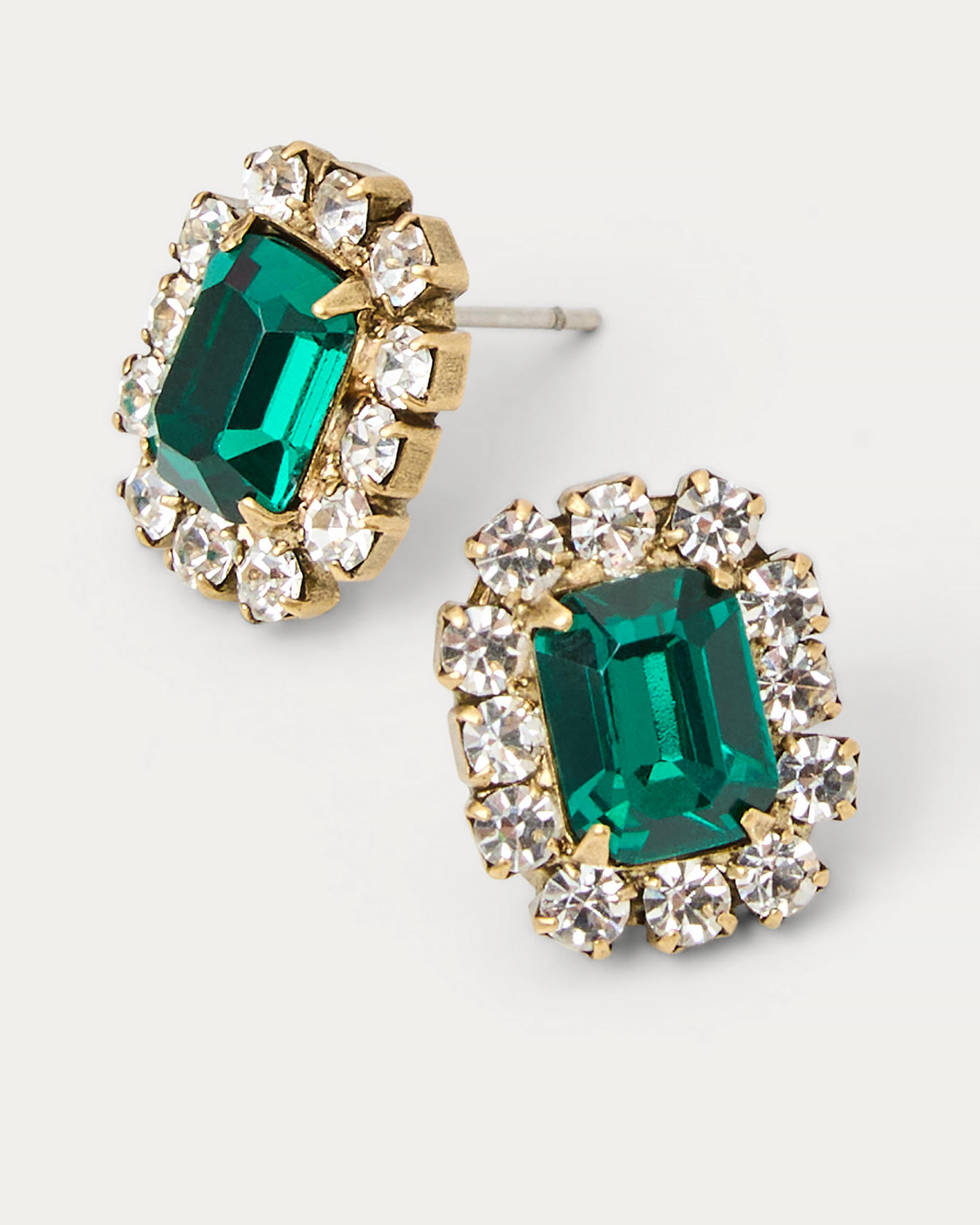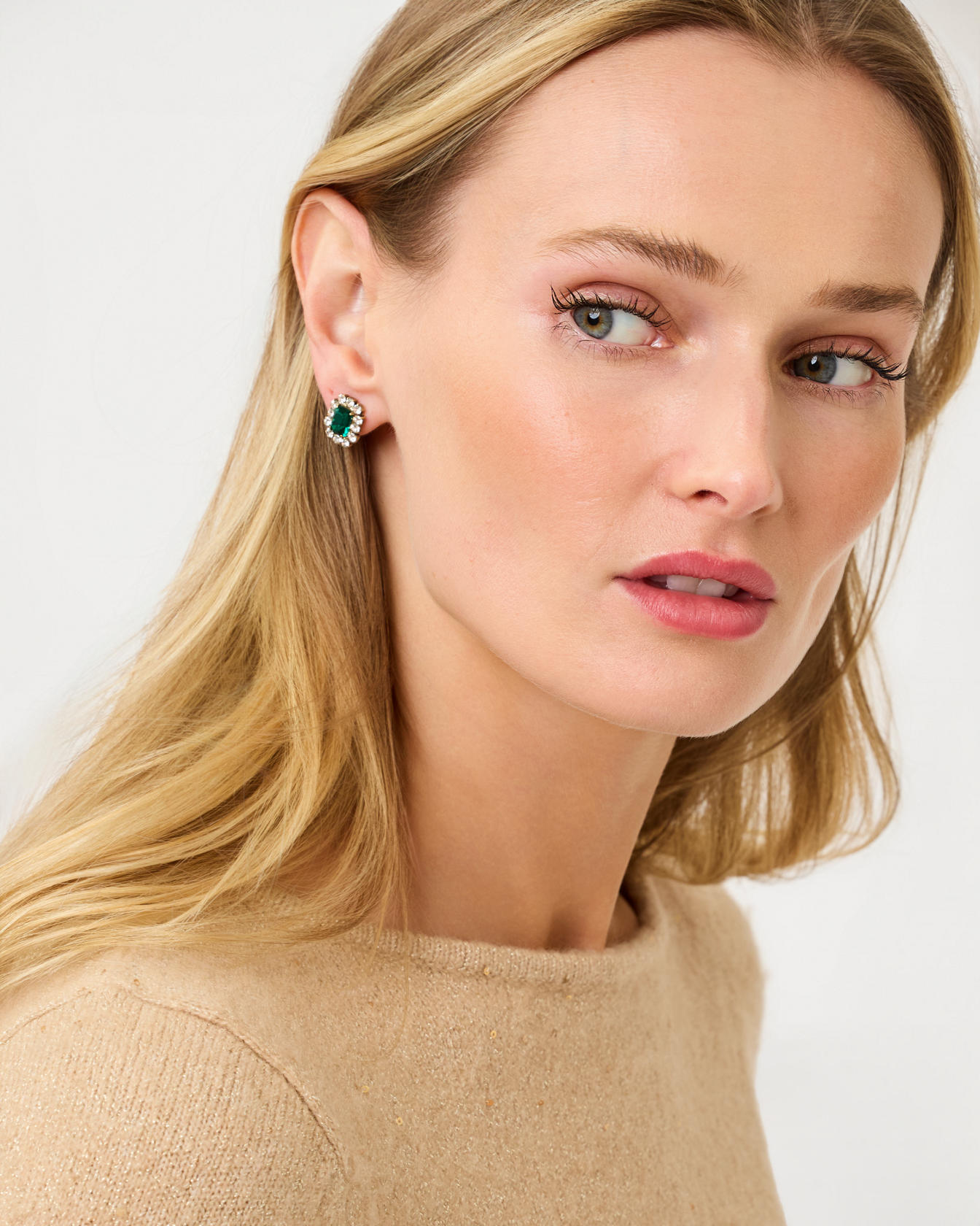 - 24K gold-plated stud earrings with glass and cubic zirconia stones.