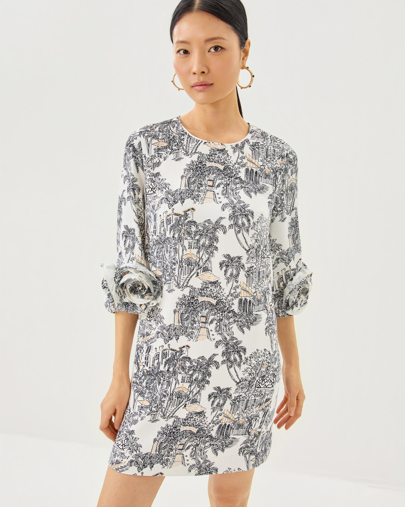 • Straight fit, crew neck shift dress with 3/4 length bell sleeves and rosette detail.