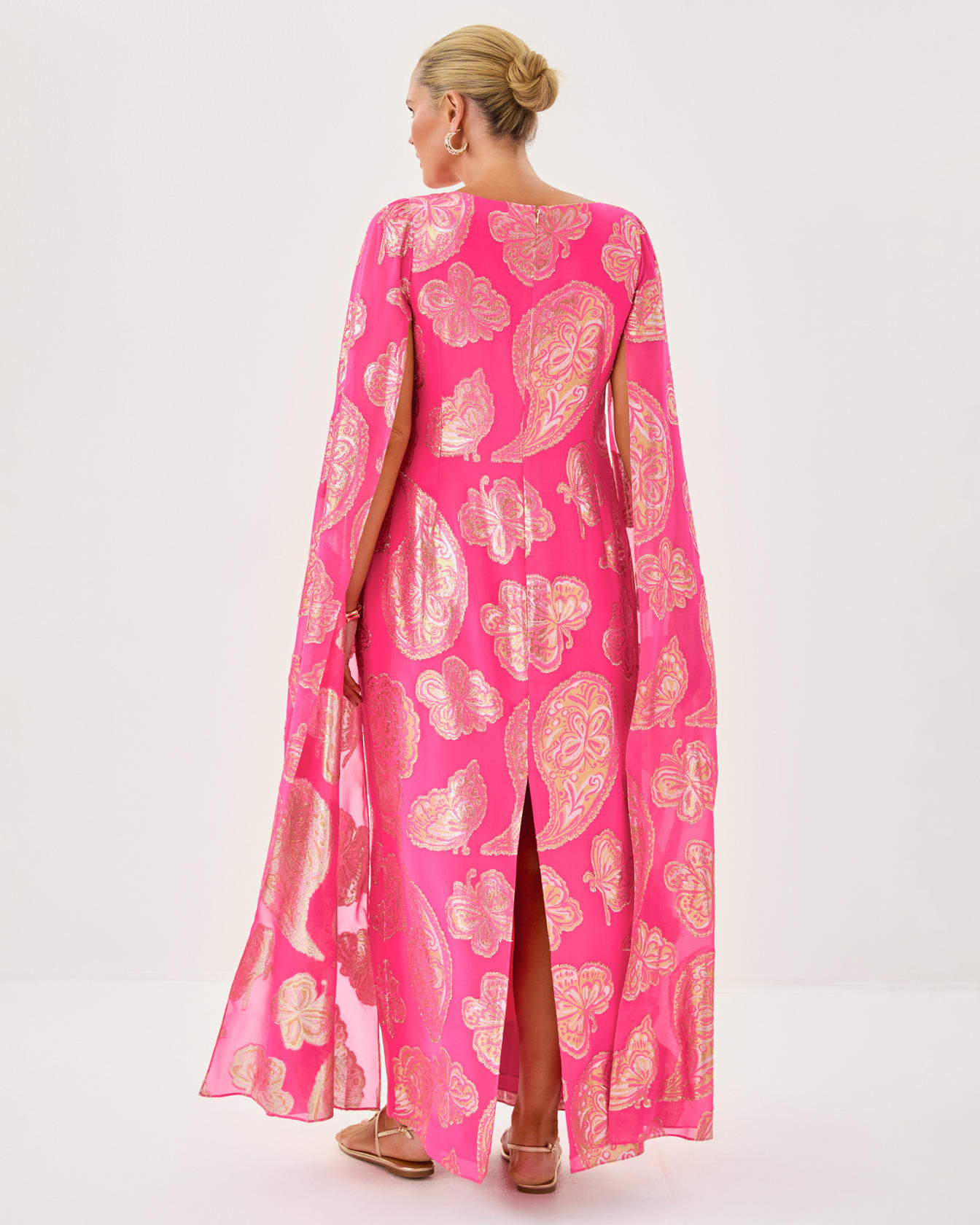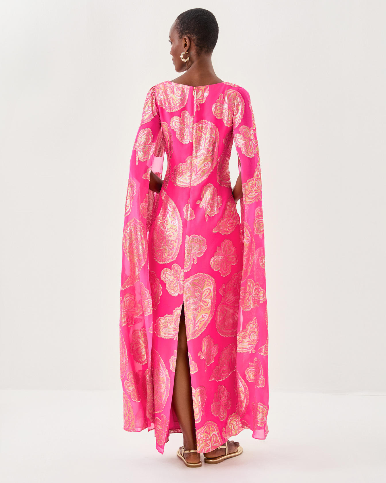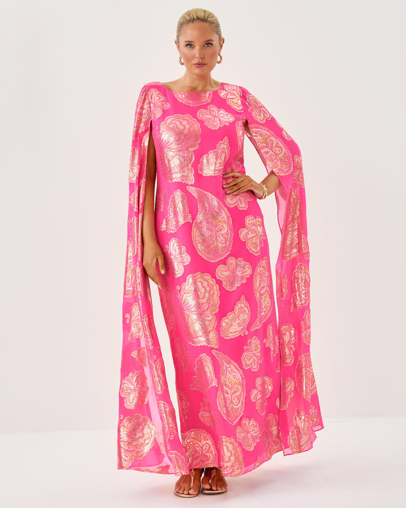 • Fitted, maxi caftan with a boat neckline and cape sleeves.