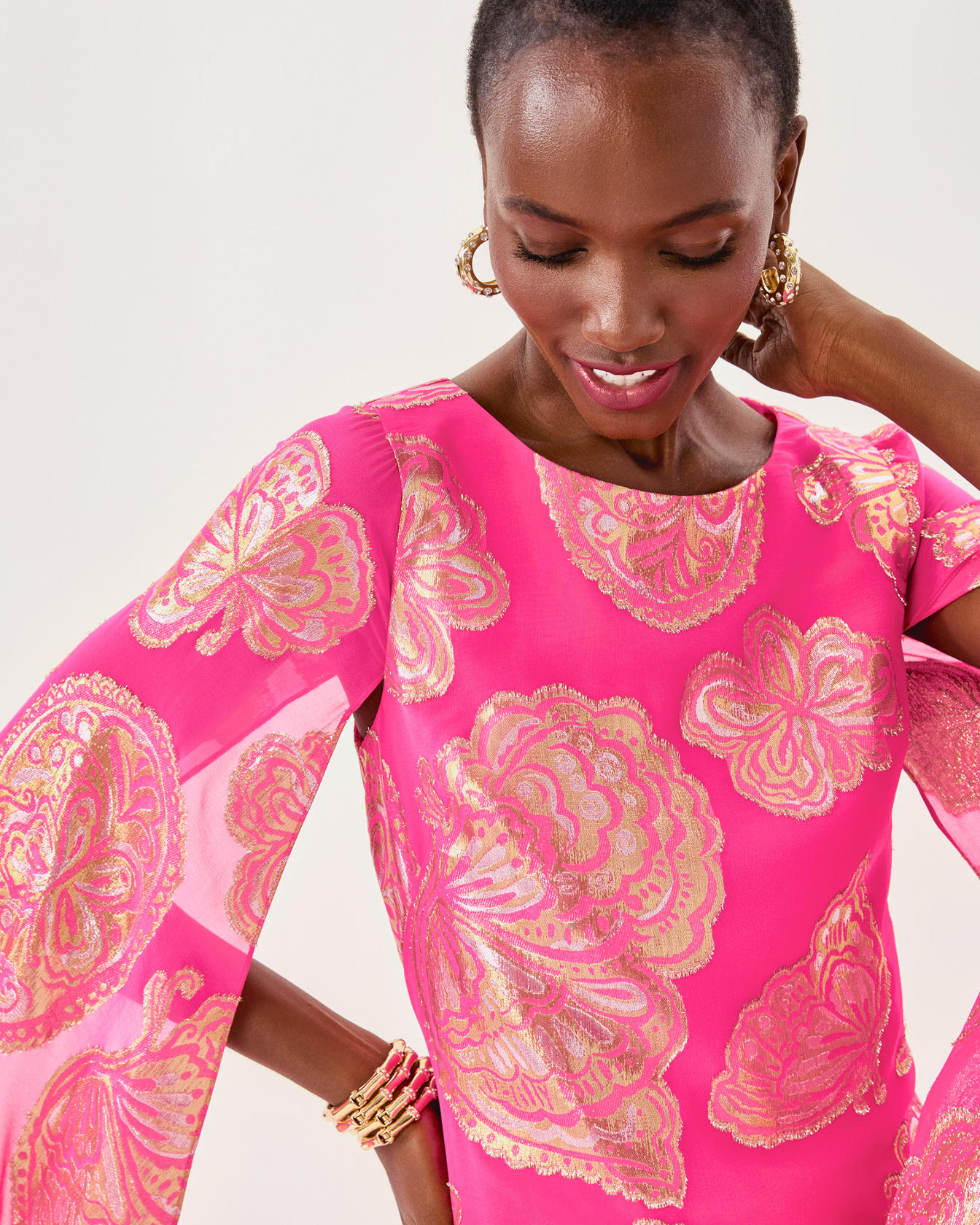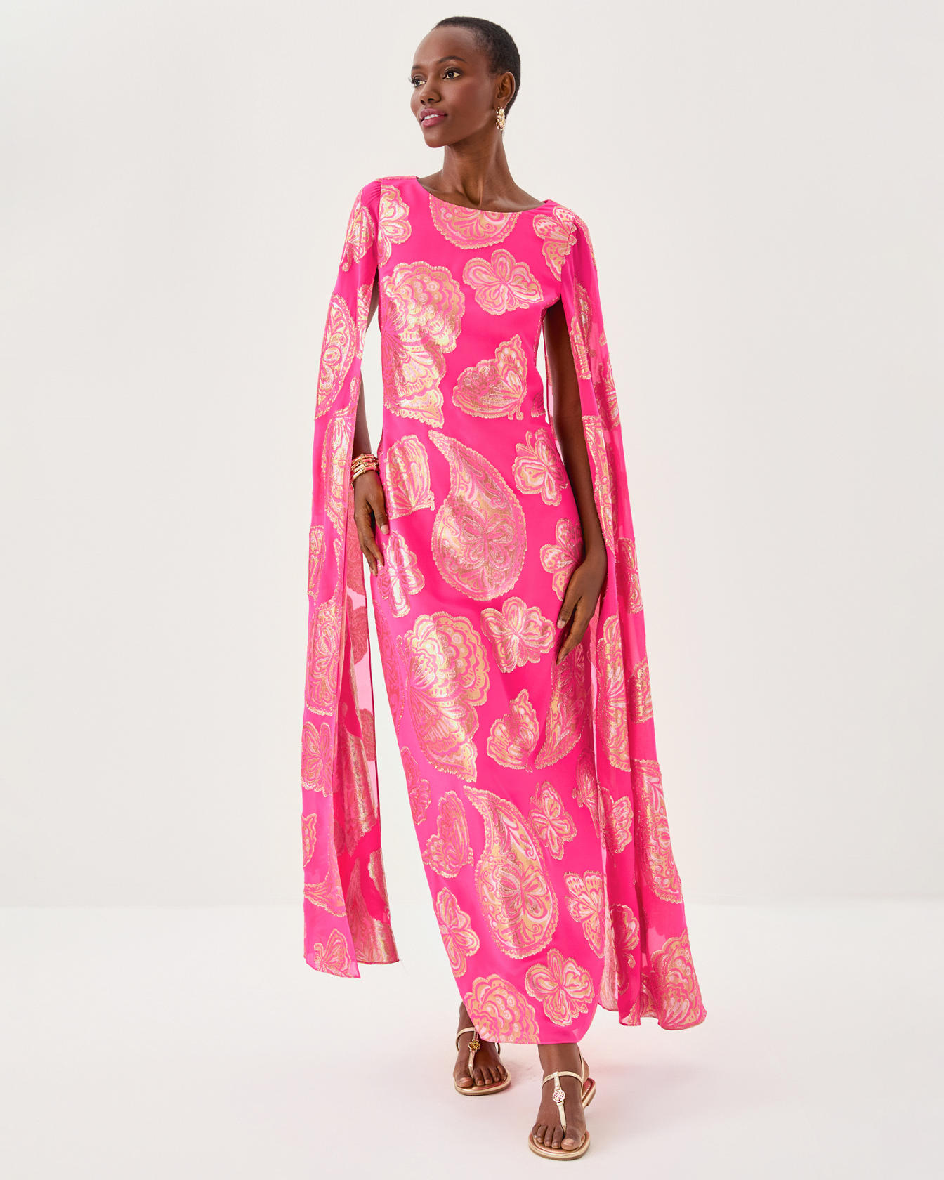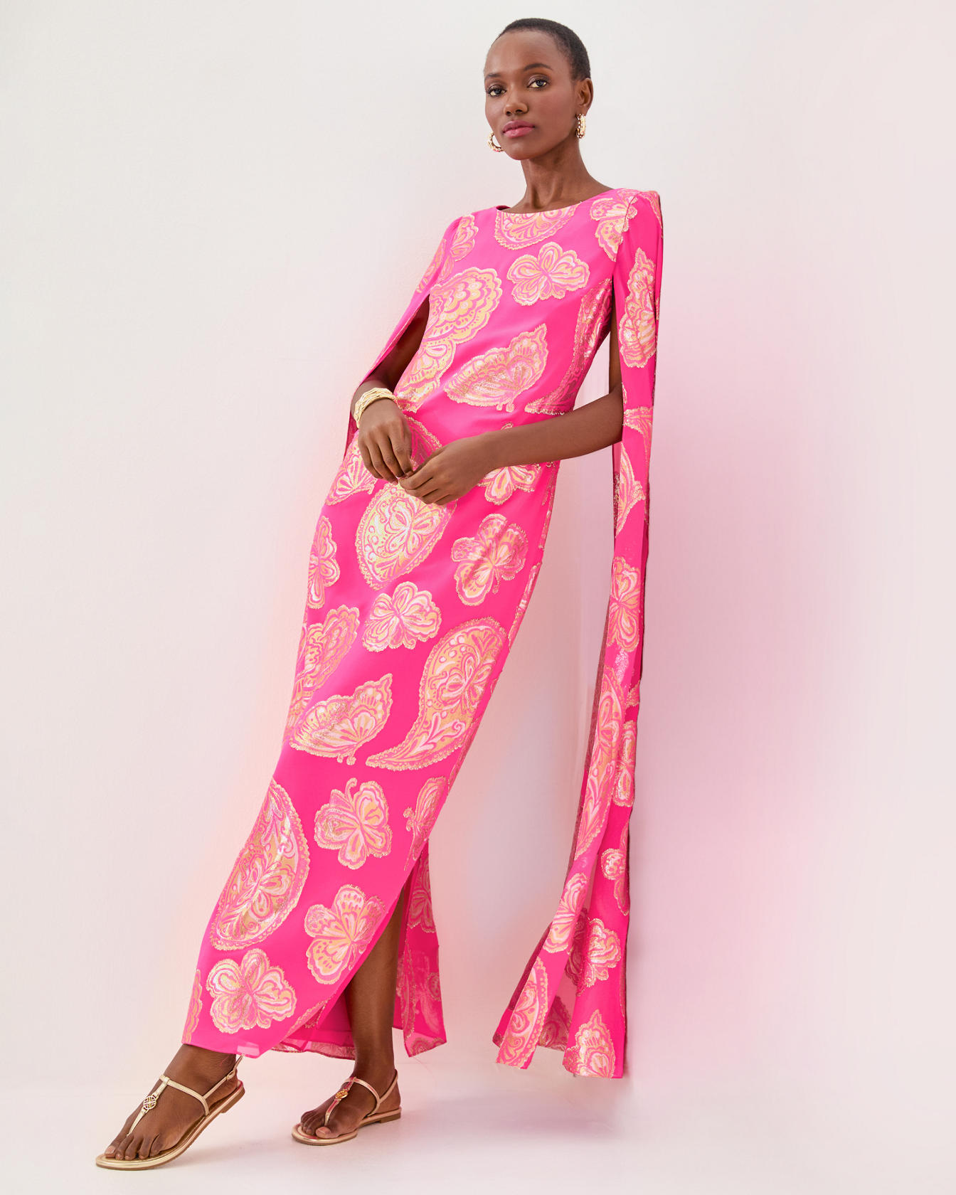 • Fitted, maxi caftan with a boat neckline and cape sleeves.