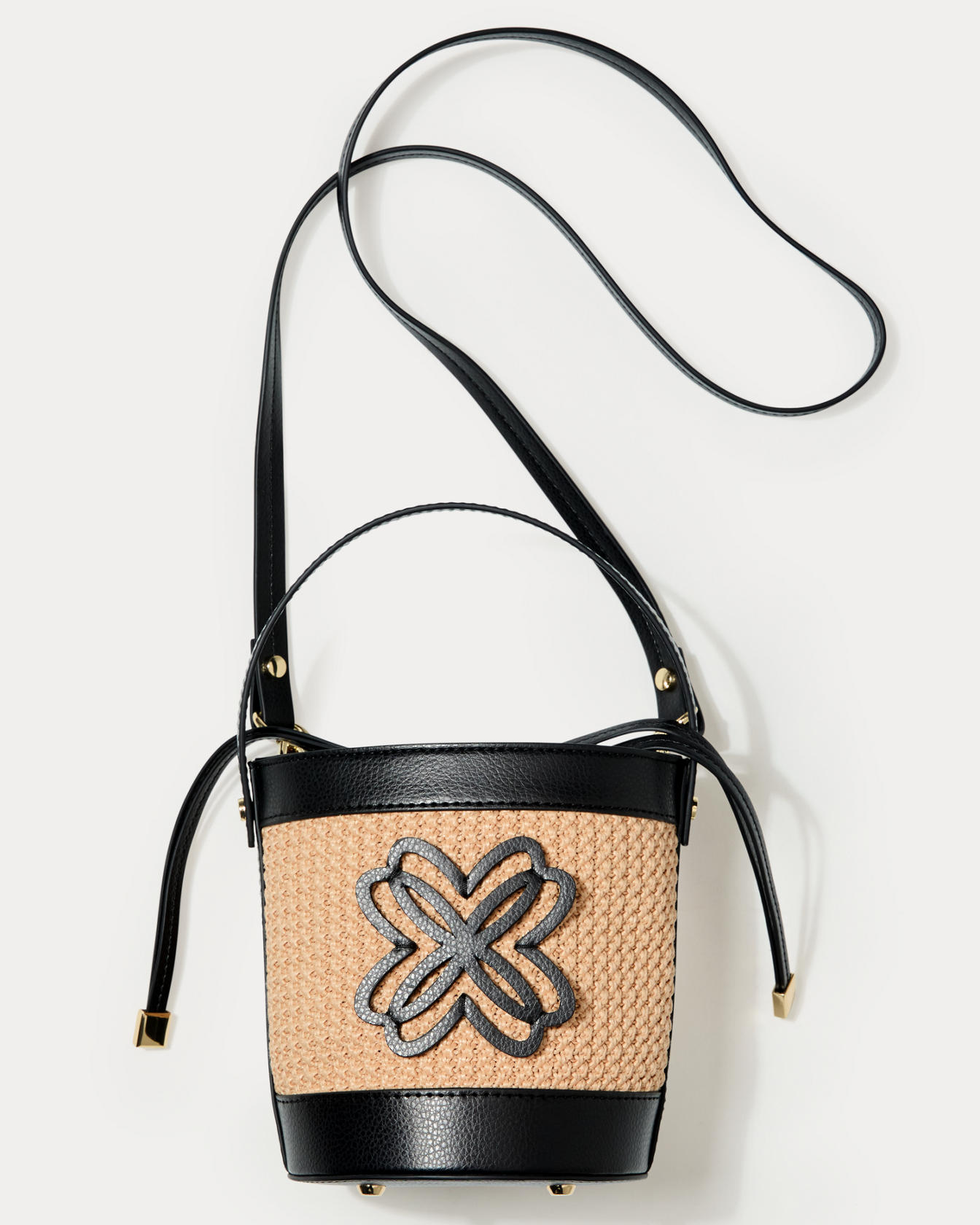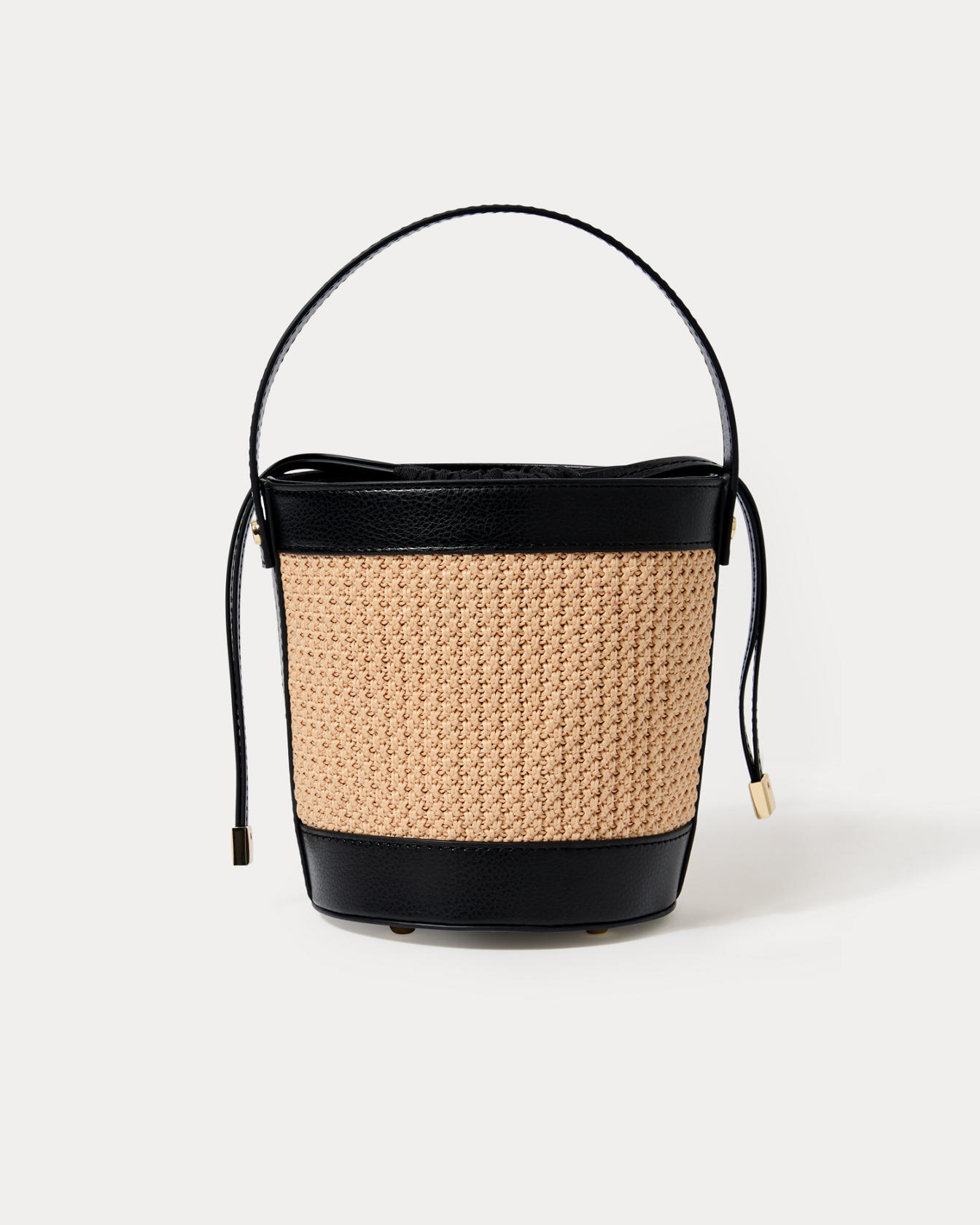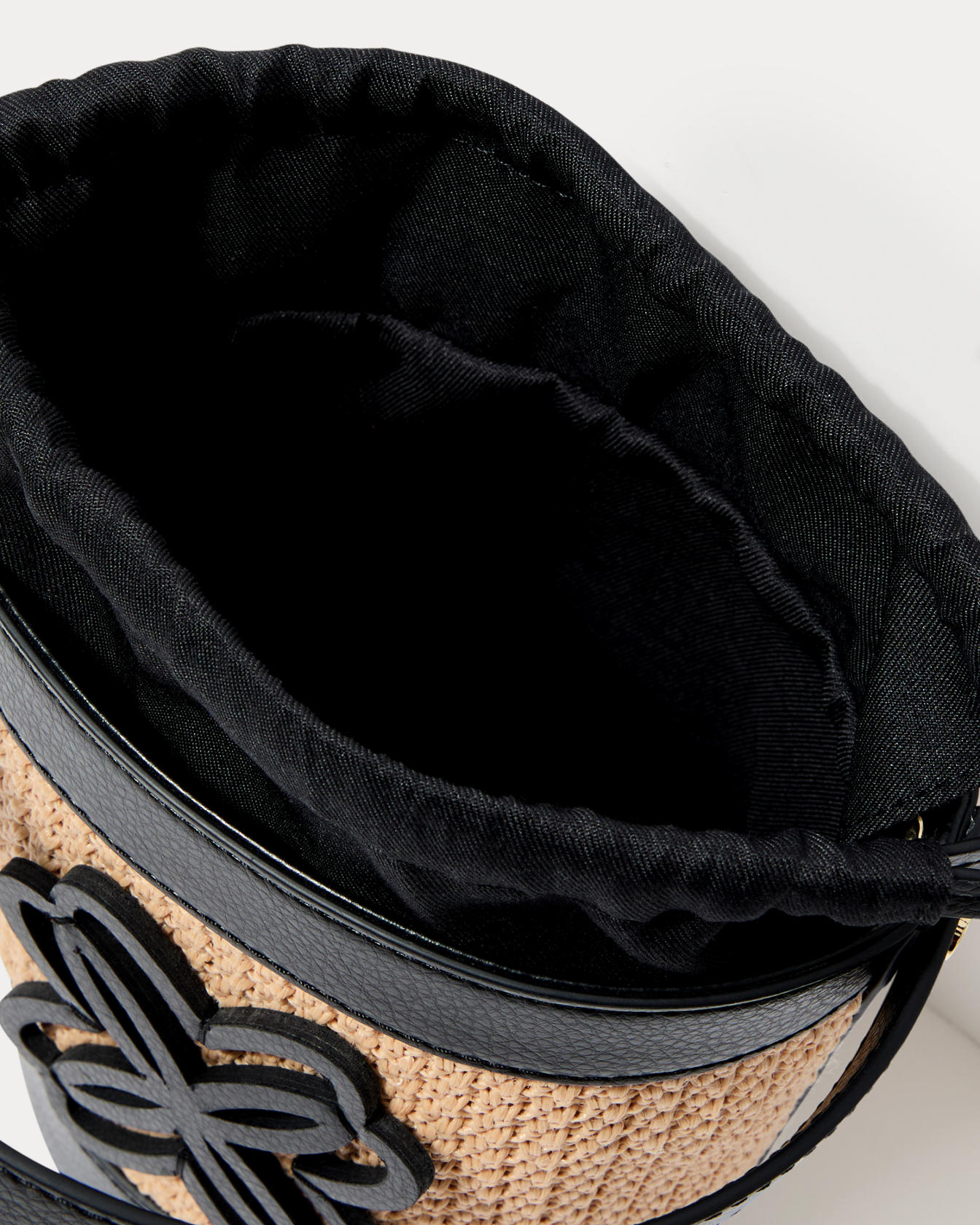 - Raffia bucket bag with a drawstring closure, cut-out logo detail, top handle, and detachable crossbody strap.