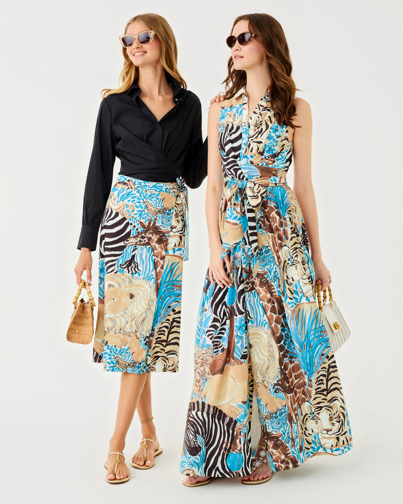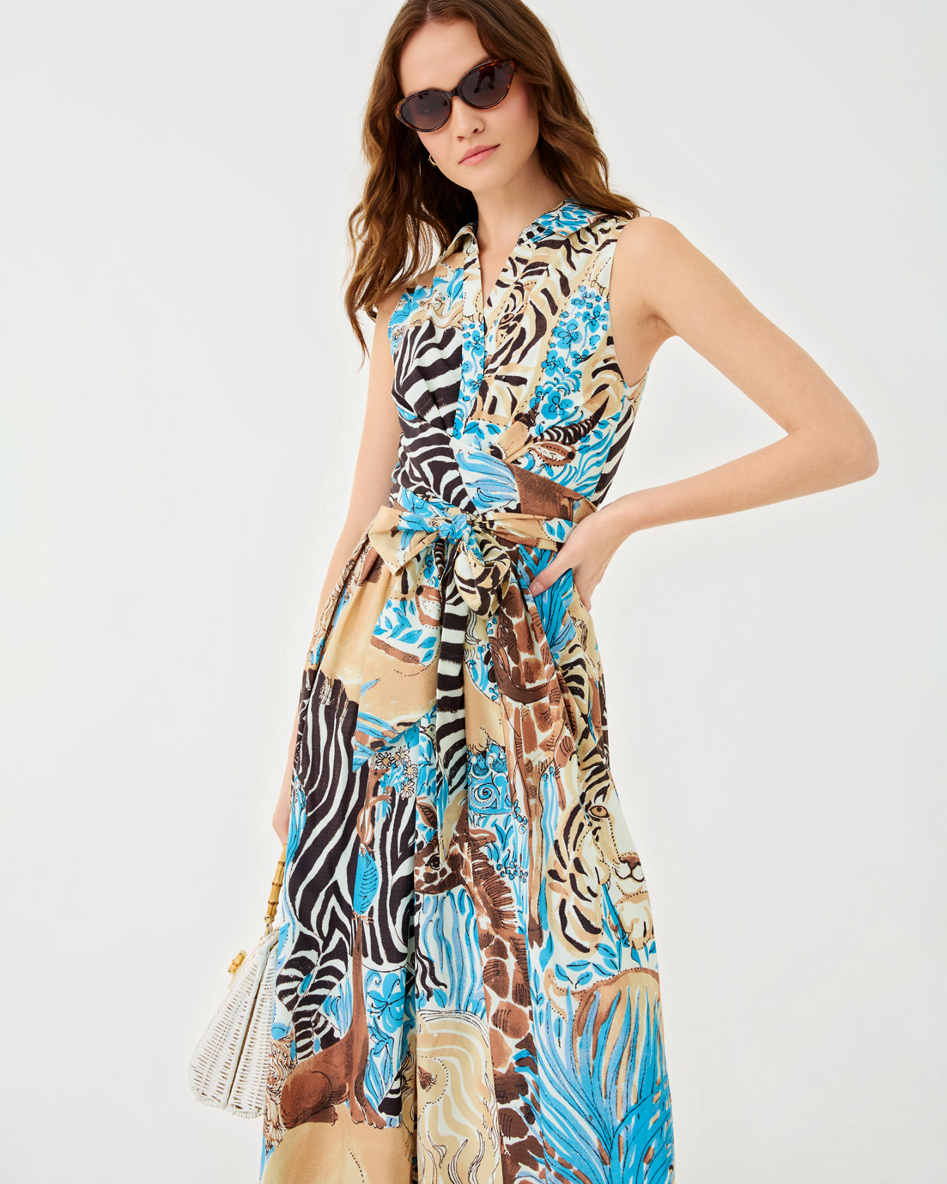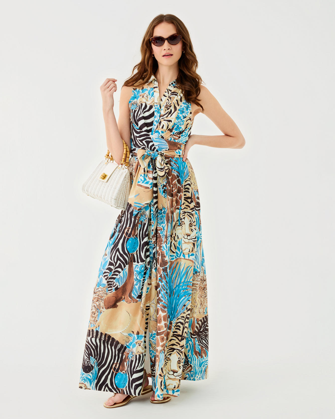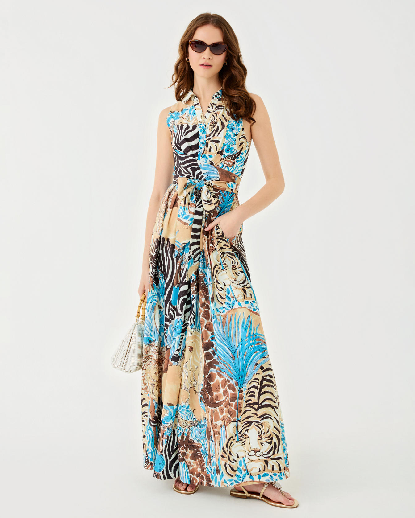 - Fit-and-flare, collared maxi shirtdress with a wrap waist tie detail, pleated skirt, and side seam pockets.