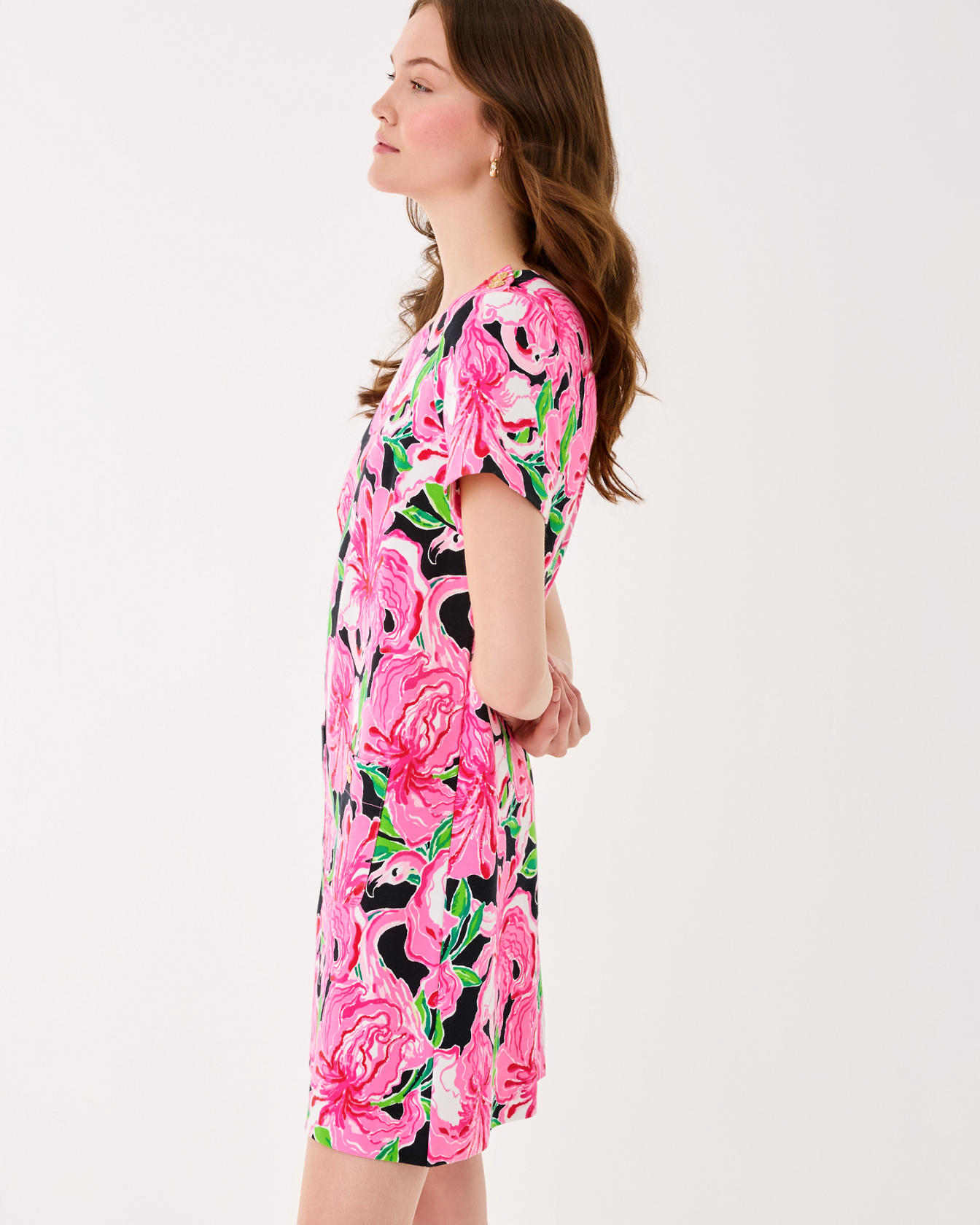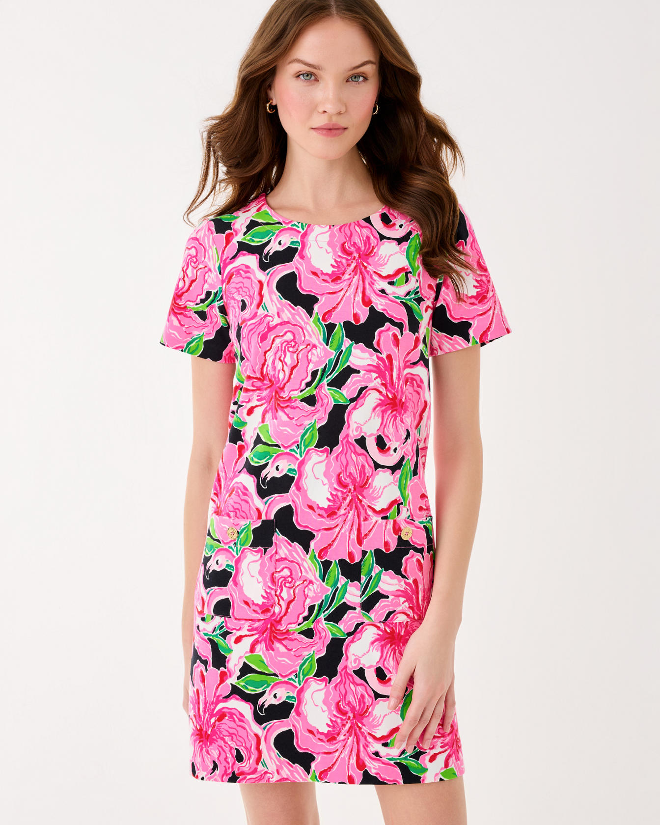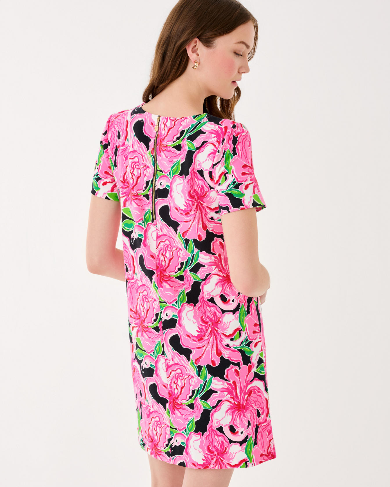 • Easy fit shift dress with a crew neckline, short sleeves, gold buttons, and an exposed back metal zipper.