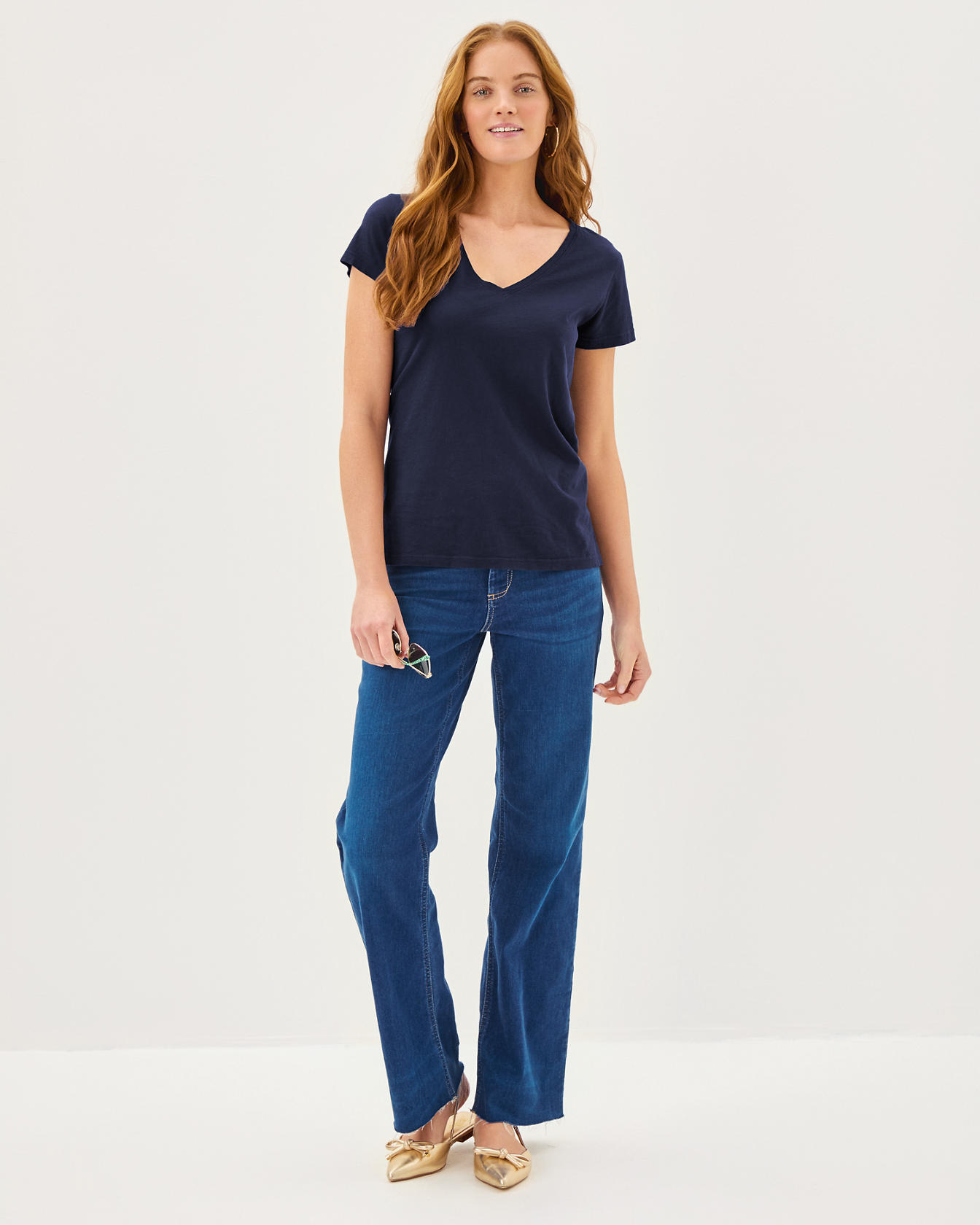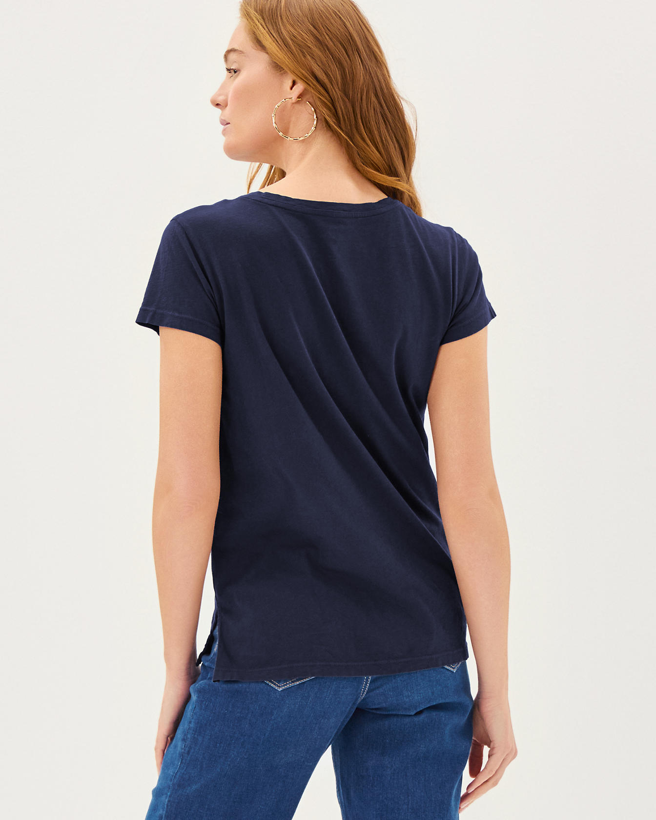 - Straight fit, short sleeve, pullover tee with a V-neckline.