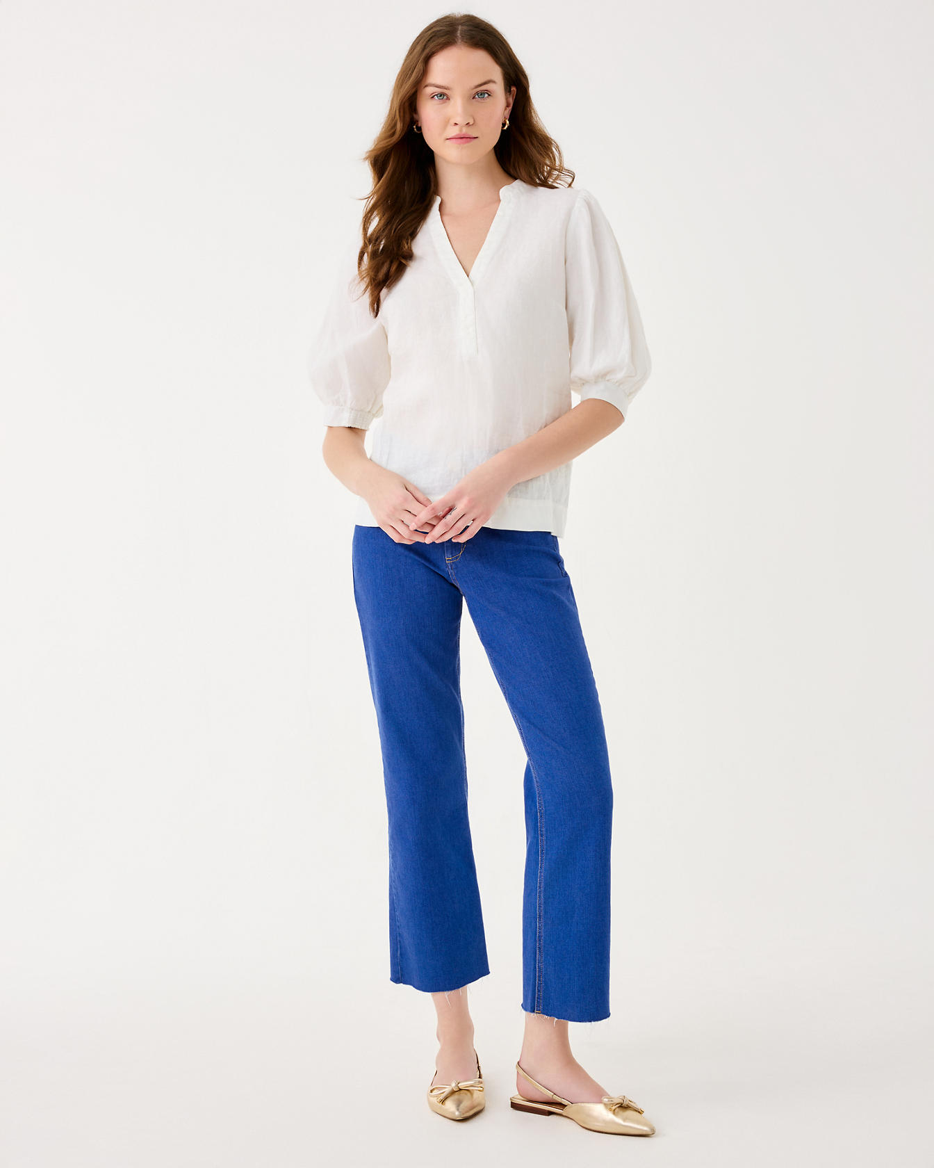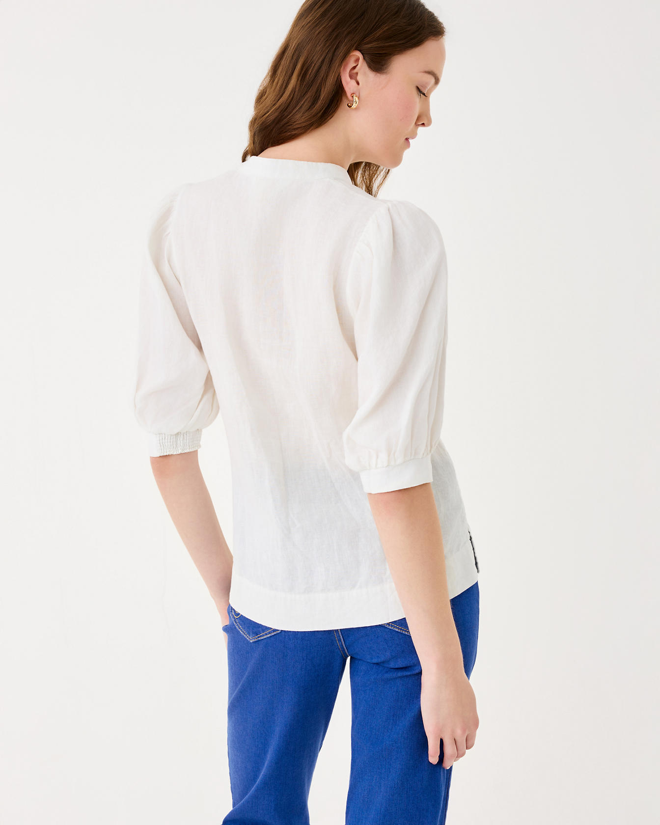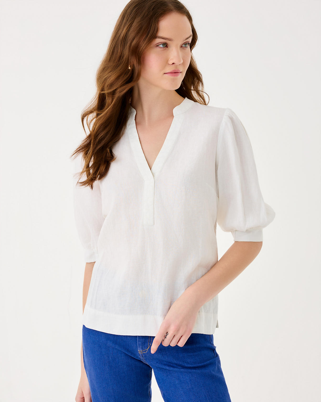 - Easy fit top with a collar and elbow-length puff sleeves.