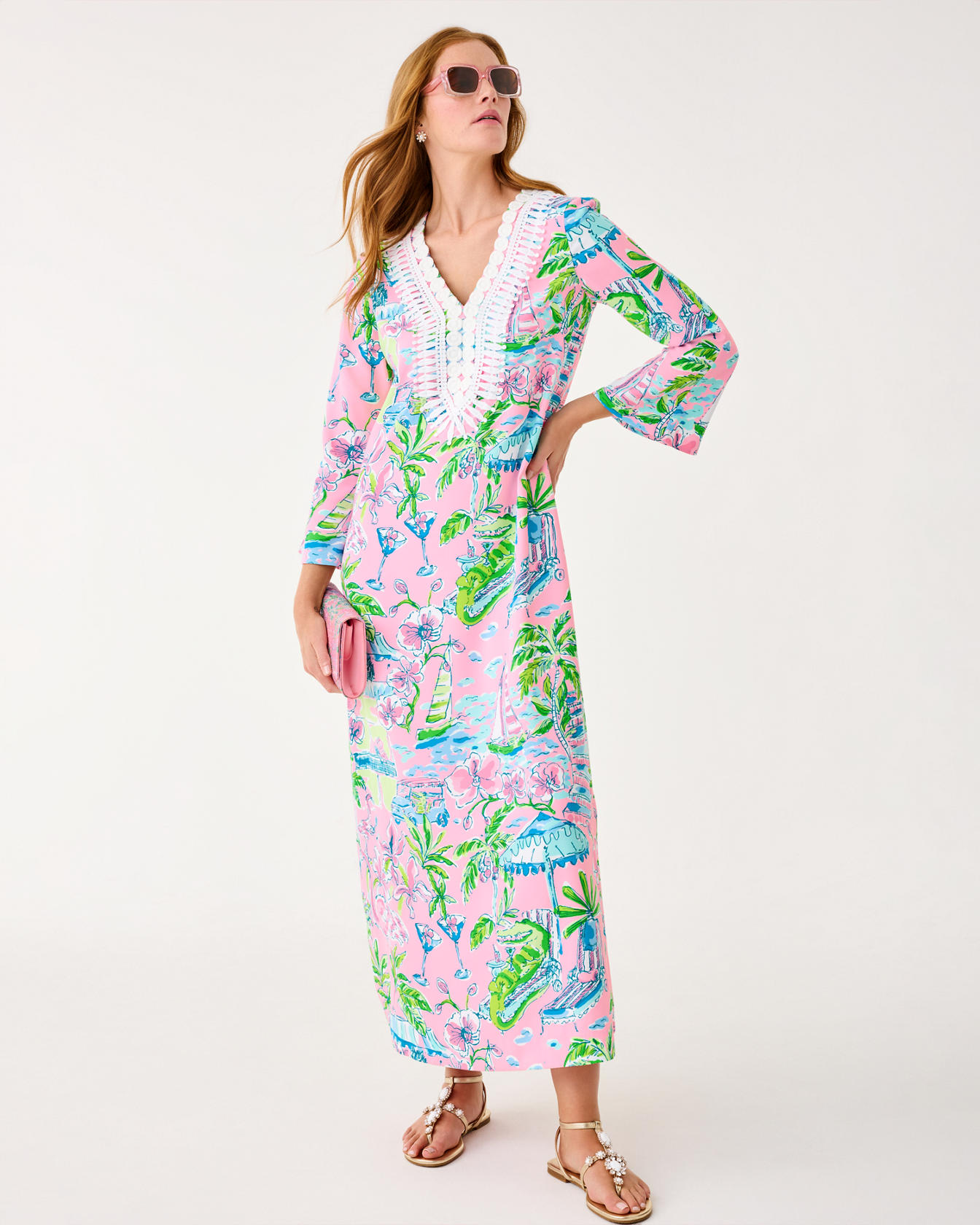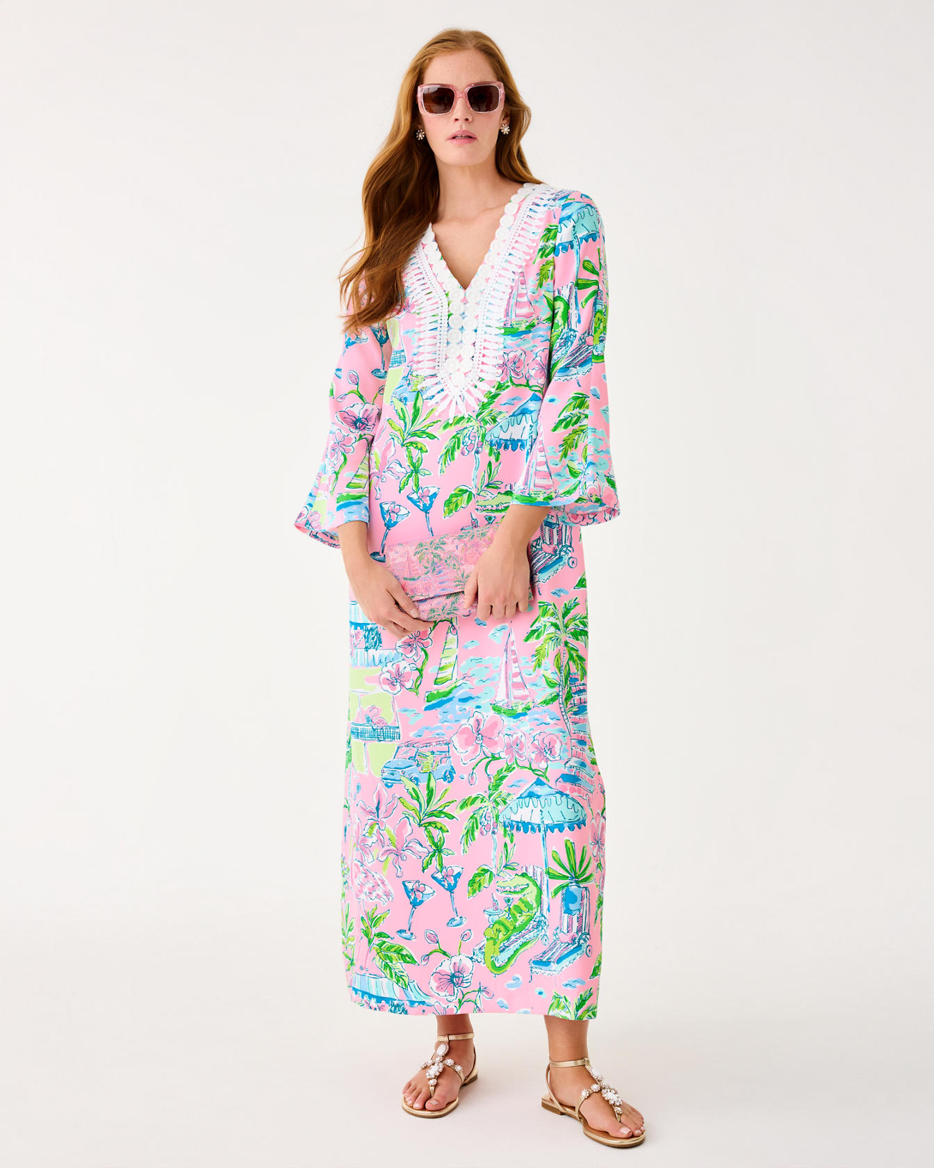 • Easy fit, v-neck, maxi caftan dress with flare sleeves, side slits, and a Lilly lace neckpiece.