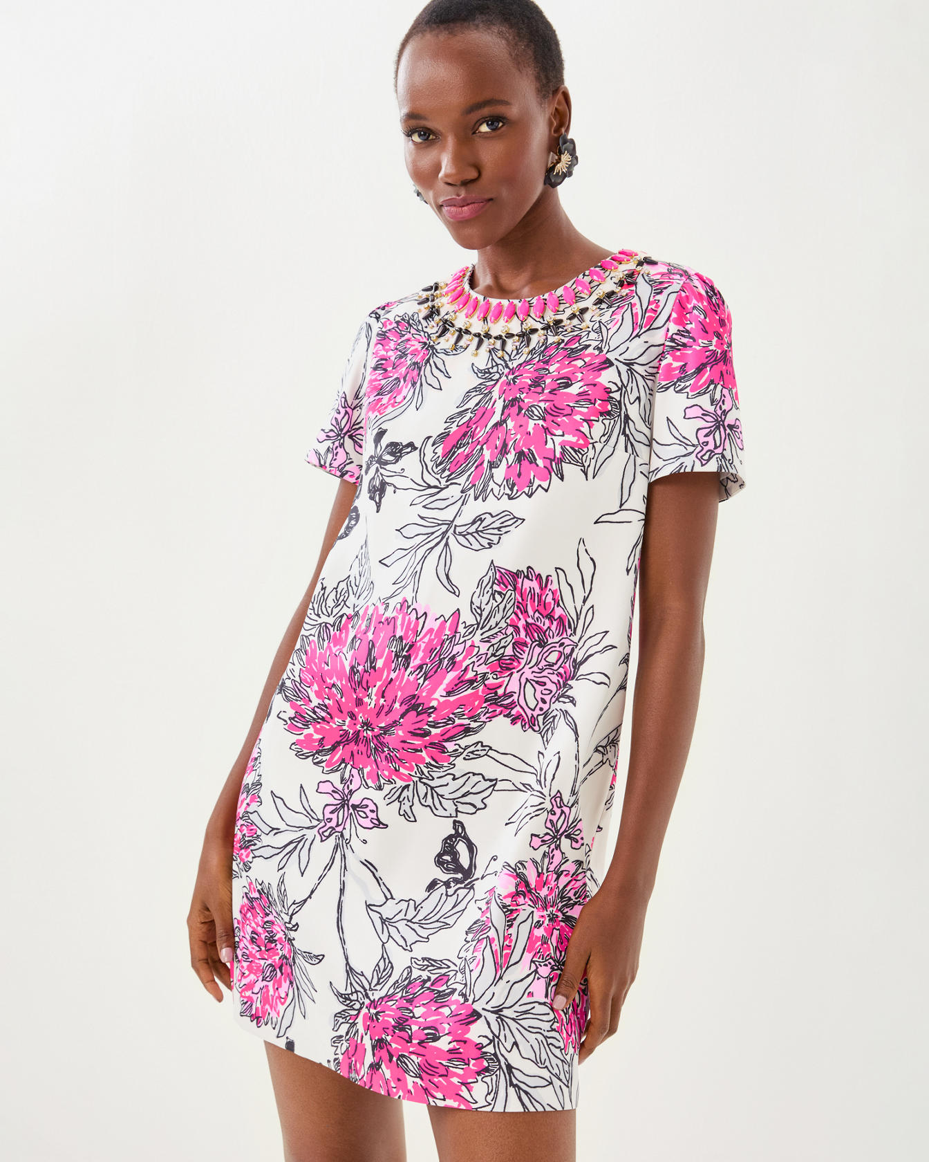 - Straight fit, short sleeve shift dress with a beaded crew neckline.