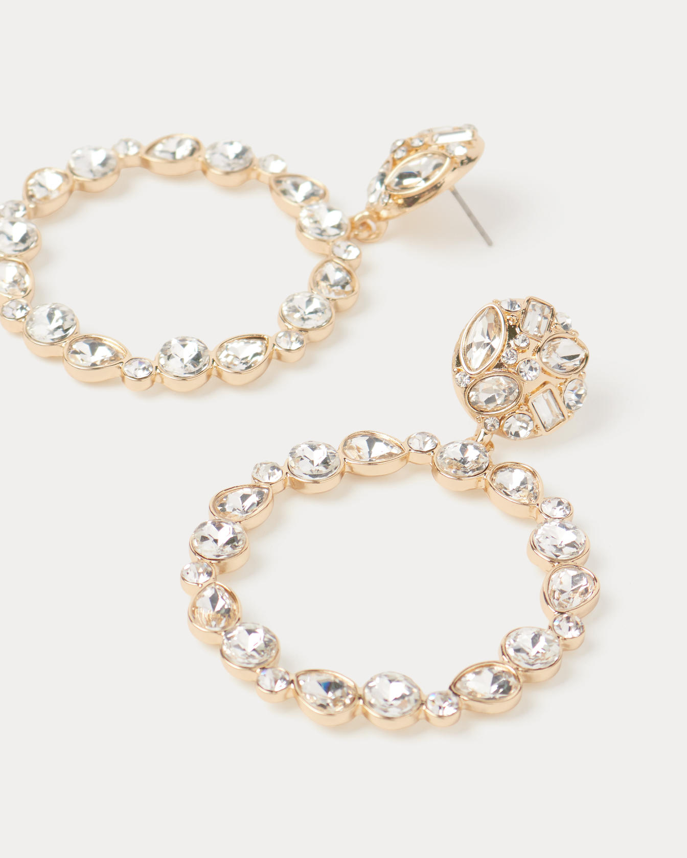 • Doorknocker hoop earrings with faceted stones.