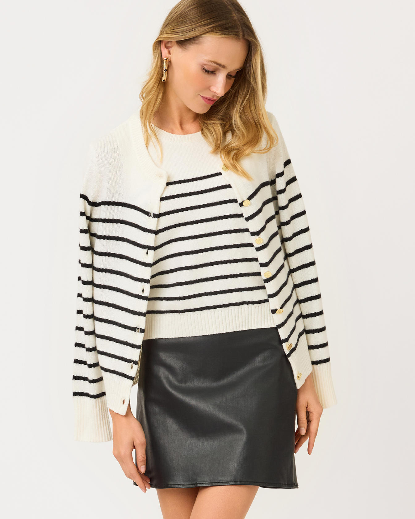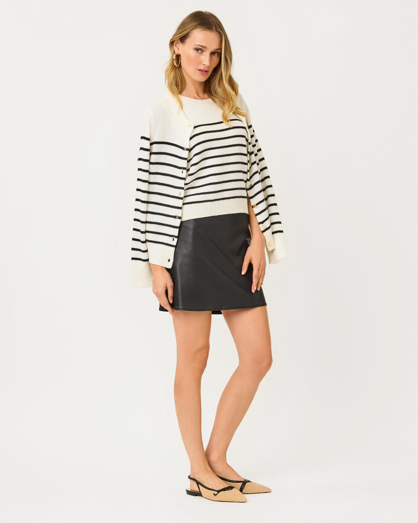 • High-rise, straight fit skirt with a side zipper, waistband, and back welt pockets.