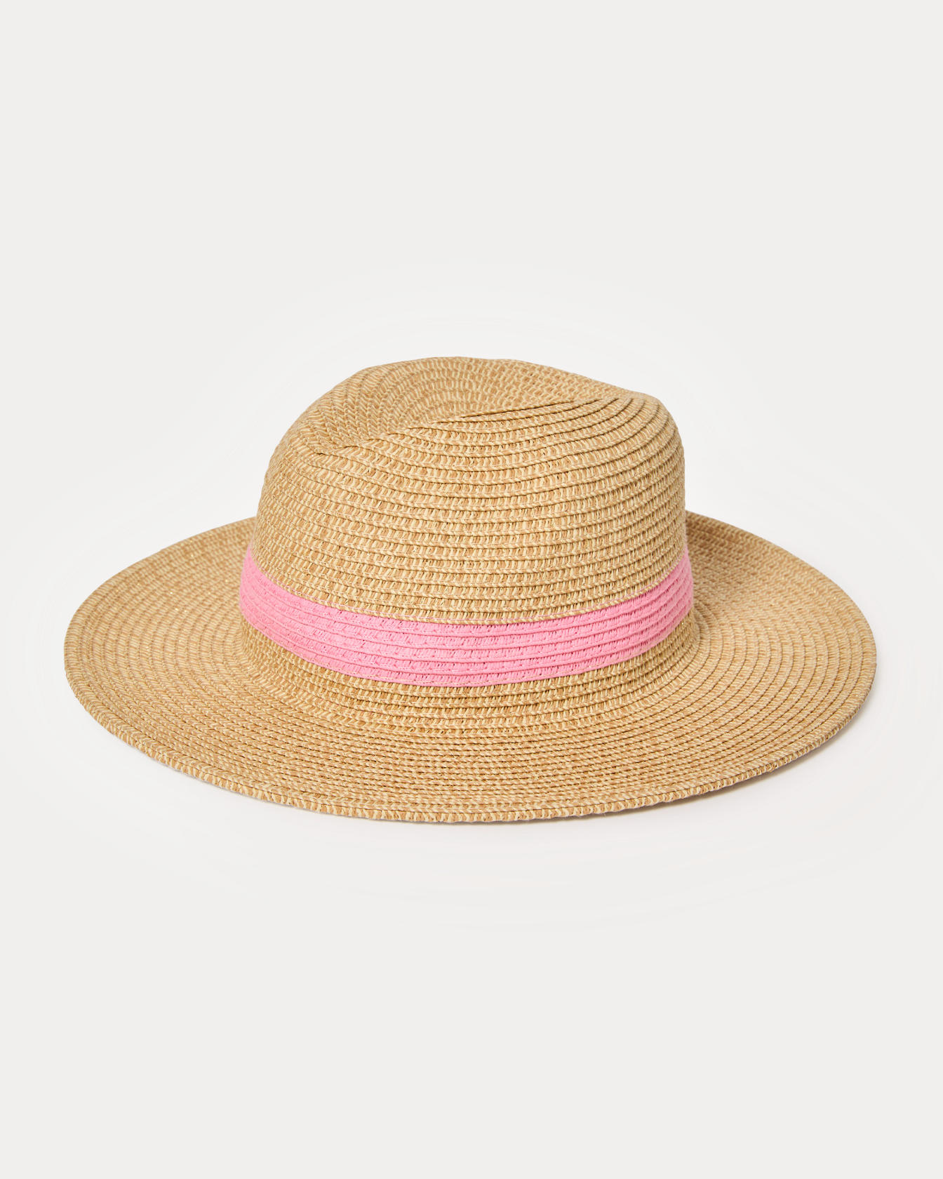 • Metallic straw hat with a wide brim, woven band, and an interior adjustable ribbon.