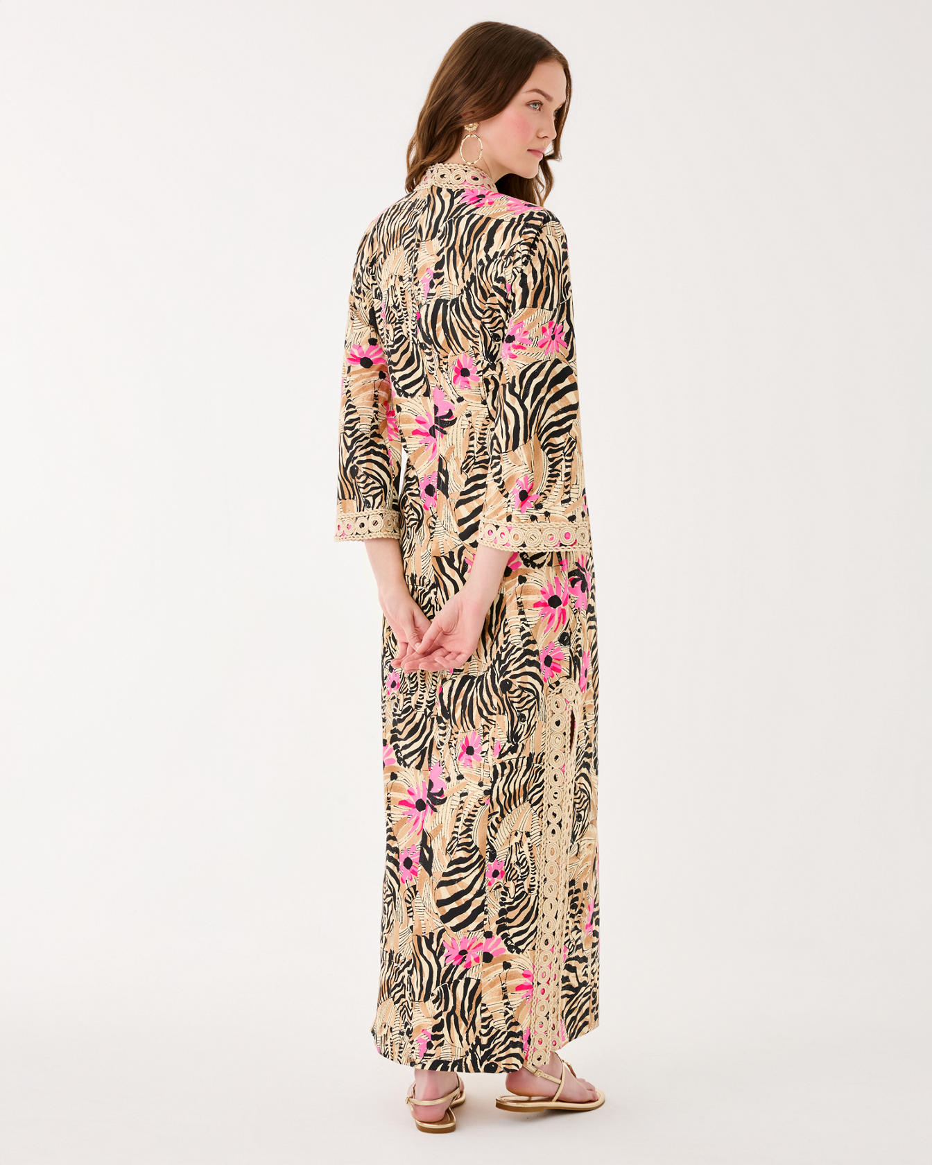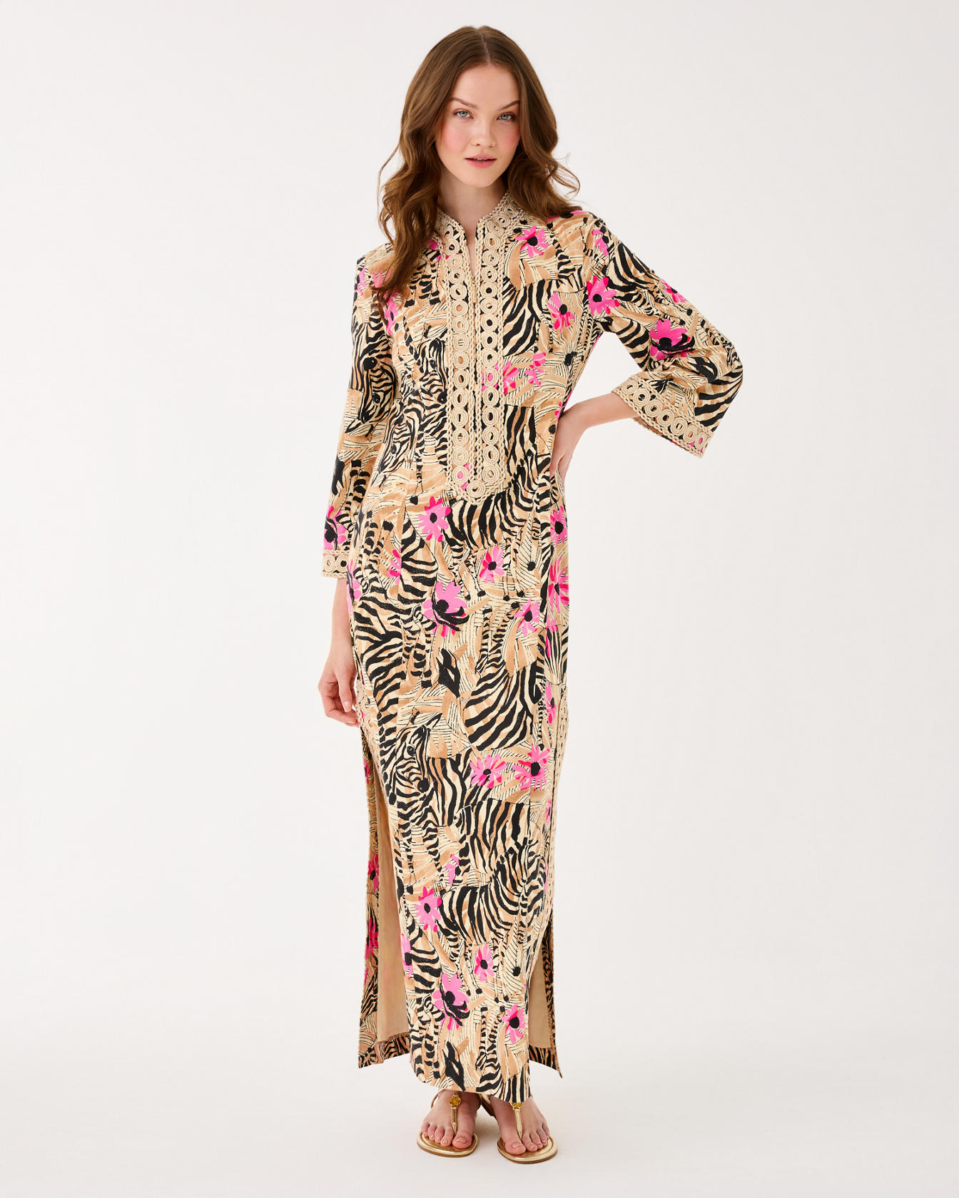 - Fitted, maxi shift caftan with a stand collar and zip-front neckline with a gold bamboo pull. Style also features 3/4 length bell sleeves, side slits, and Lilly lace trim.