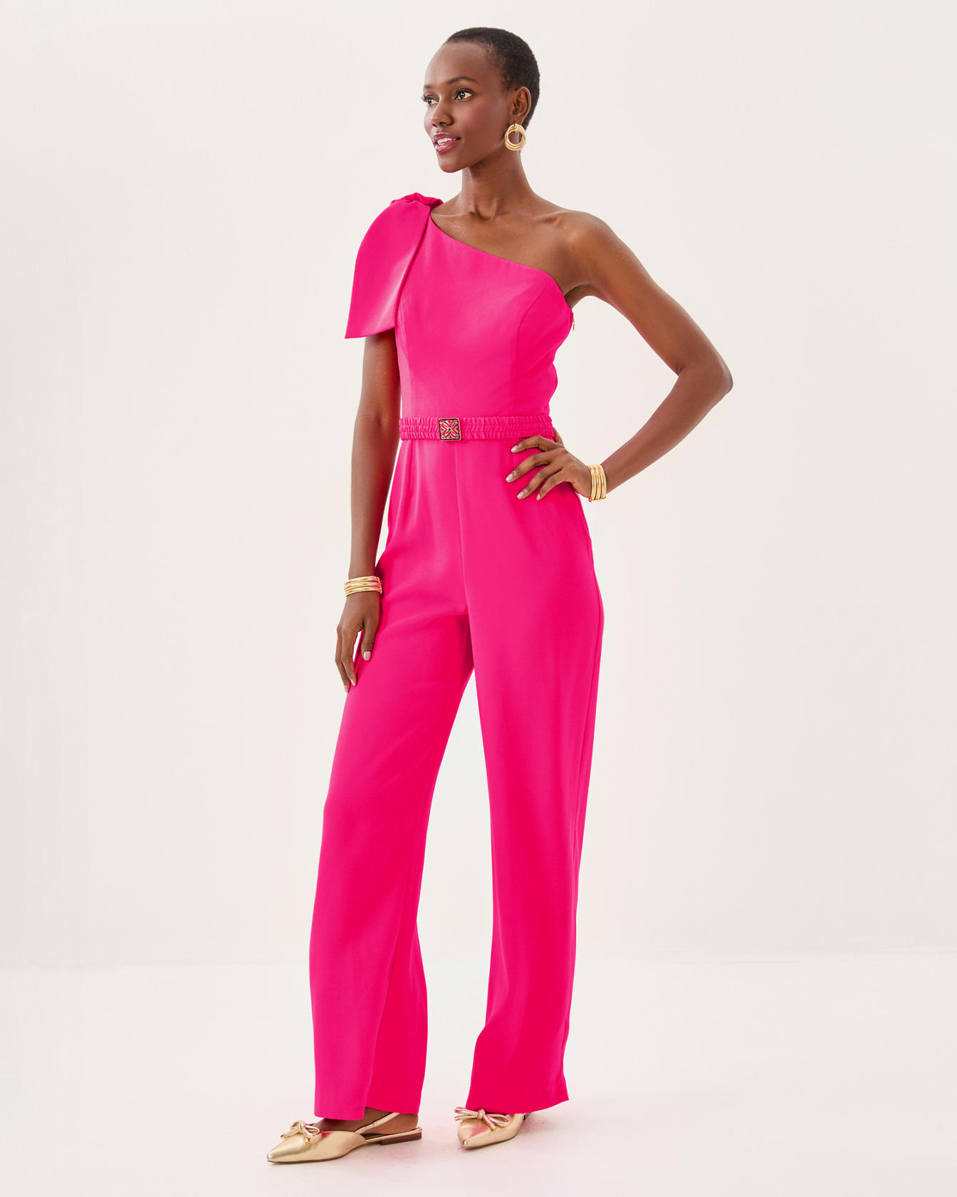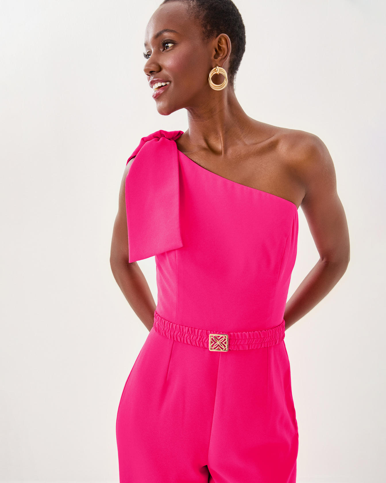 - Full length, one-shoulder jumpsuit with a bow shoulder detail, removable sash, and interior corset.