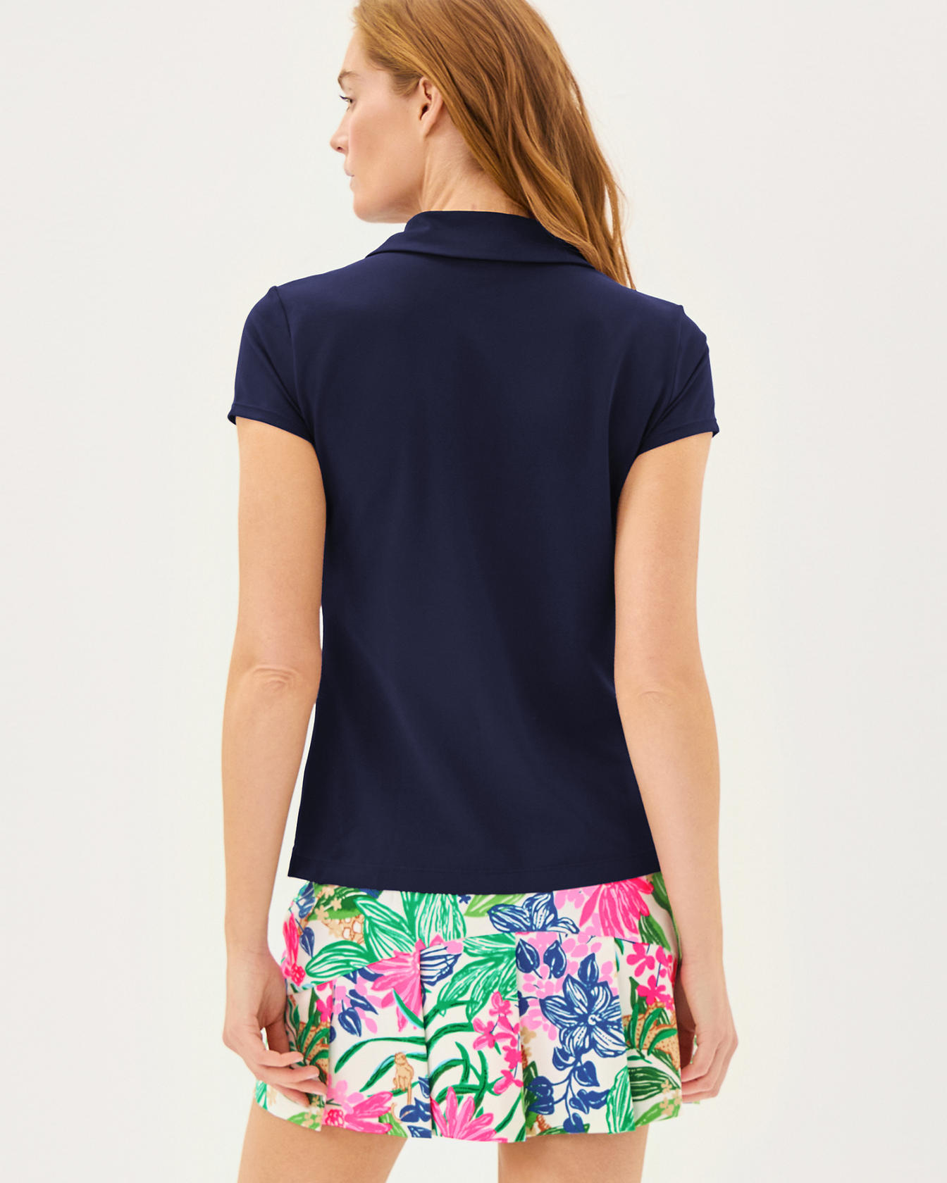 - UPF 50+ Luxletic® polo with a scalloped placket and gold buttons. Moisture wicking.