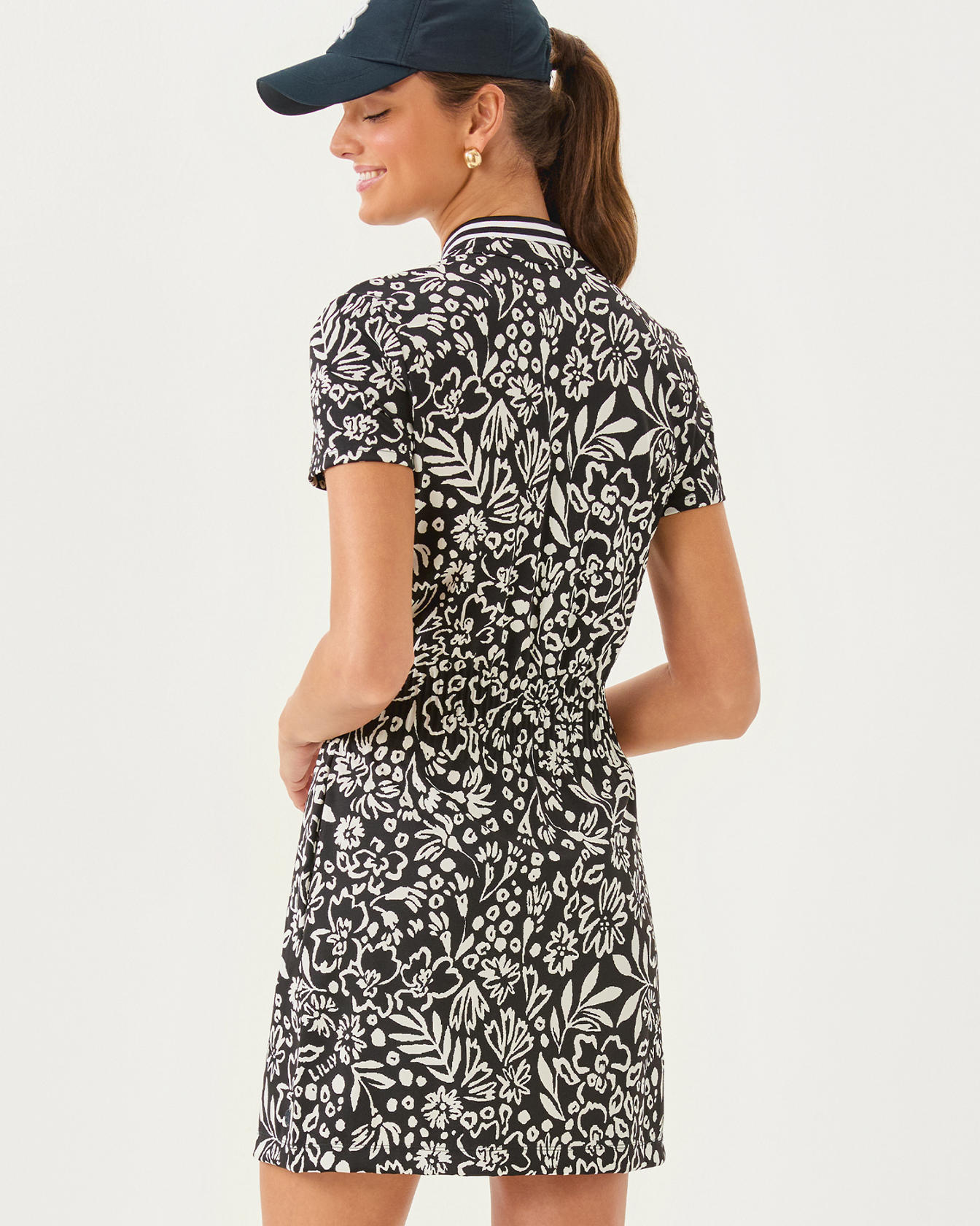 - UPF 50+ Luxletic® active polo dress with a rib collar, gold buttons, smocked waist, and side seam pockets. This style also features separate undershorts with pockets.