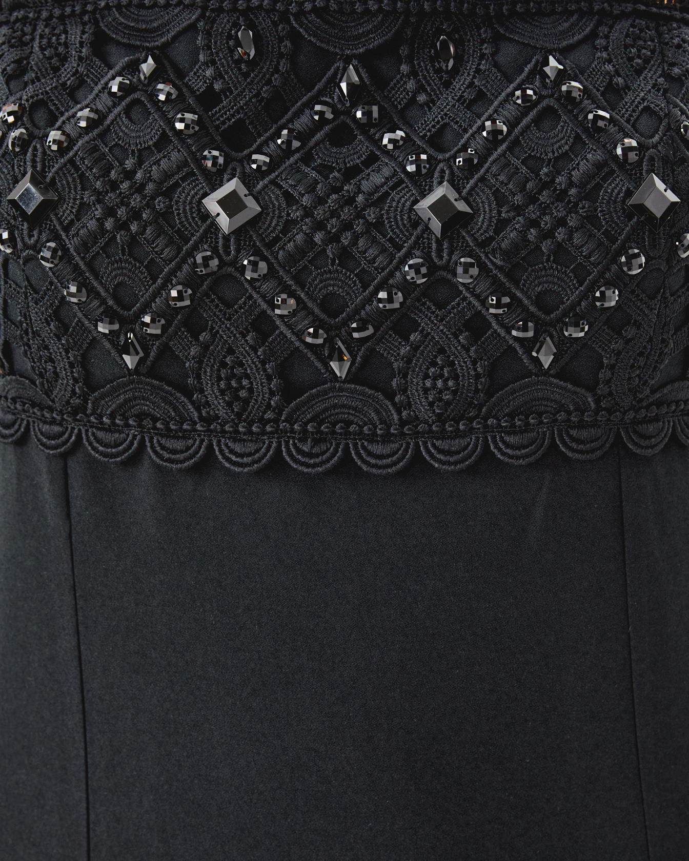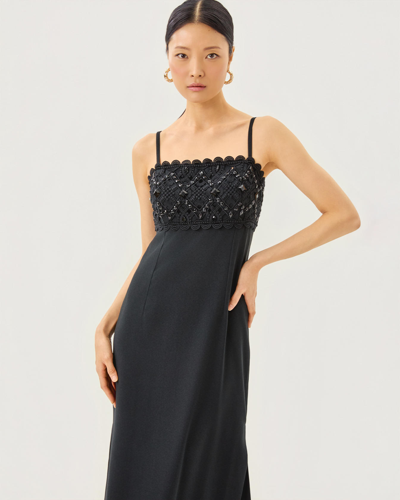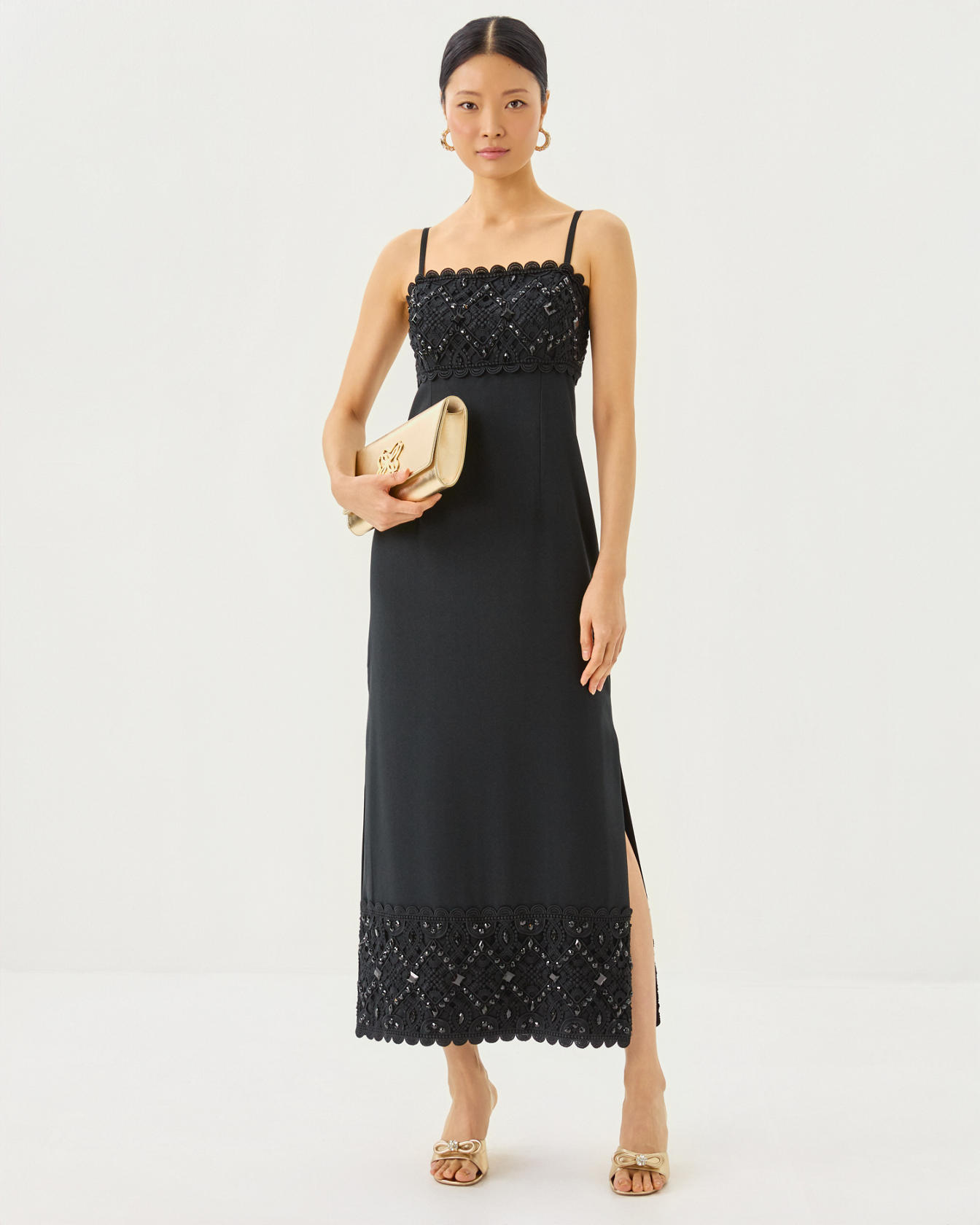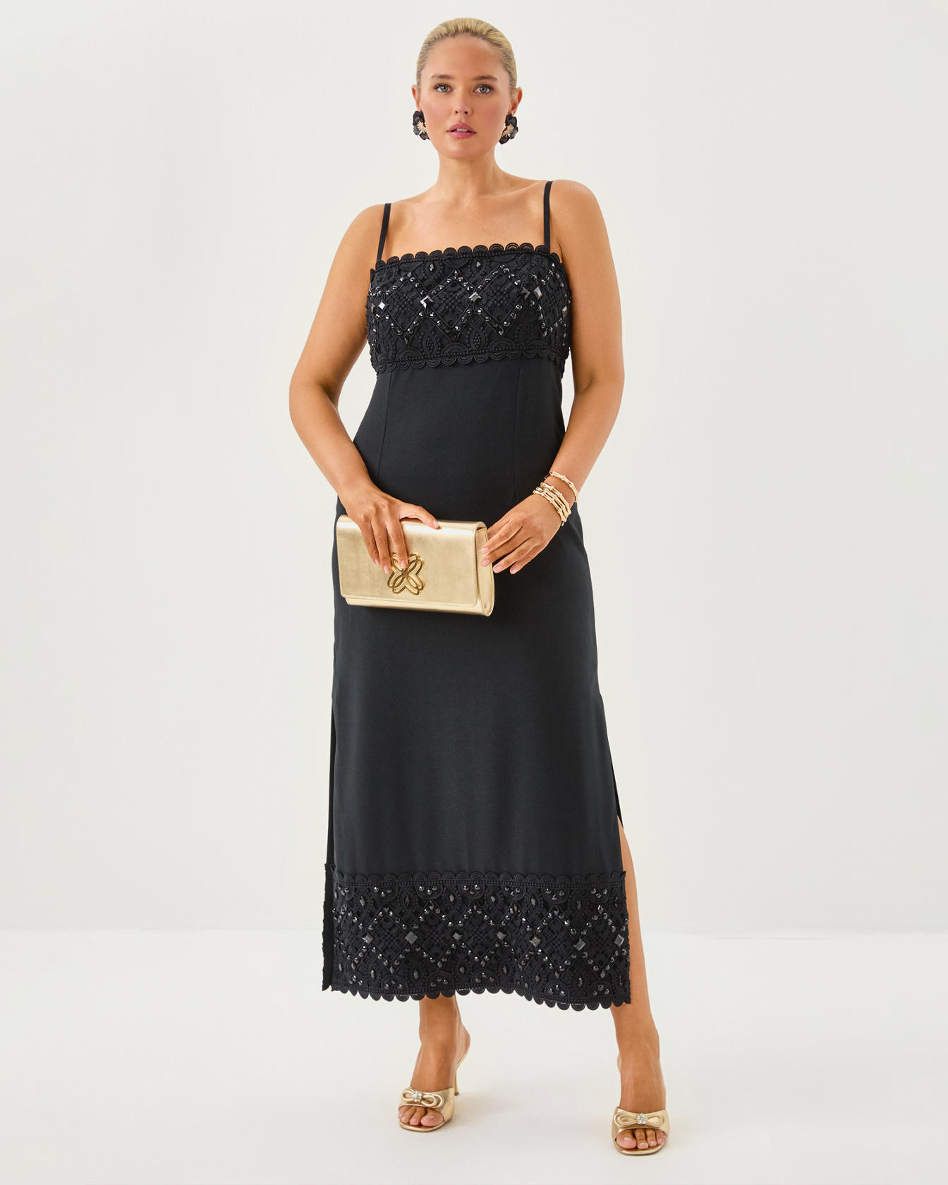 - Fitted, square neck maxi dress with adjustable spaghetti straps, bodice cups, side slits, and wide Lilly lace trim with beading.