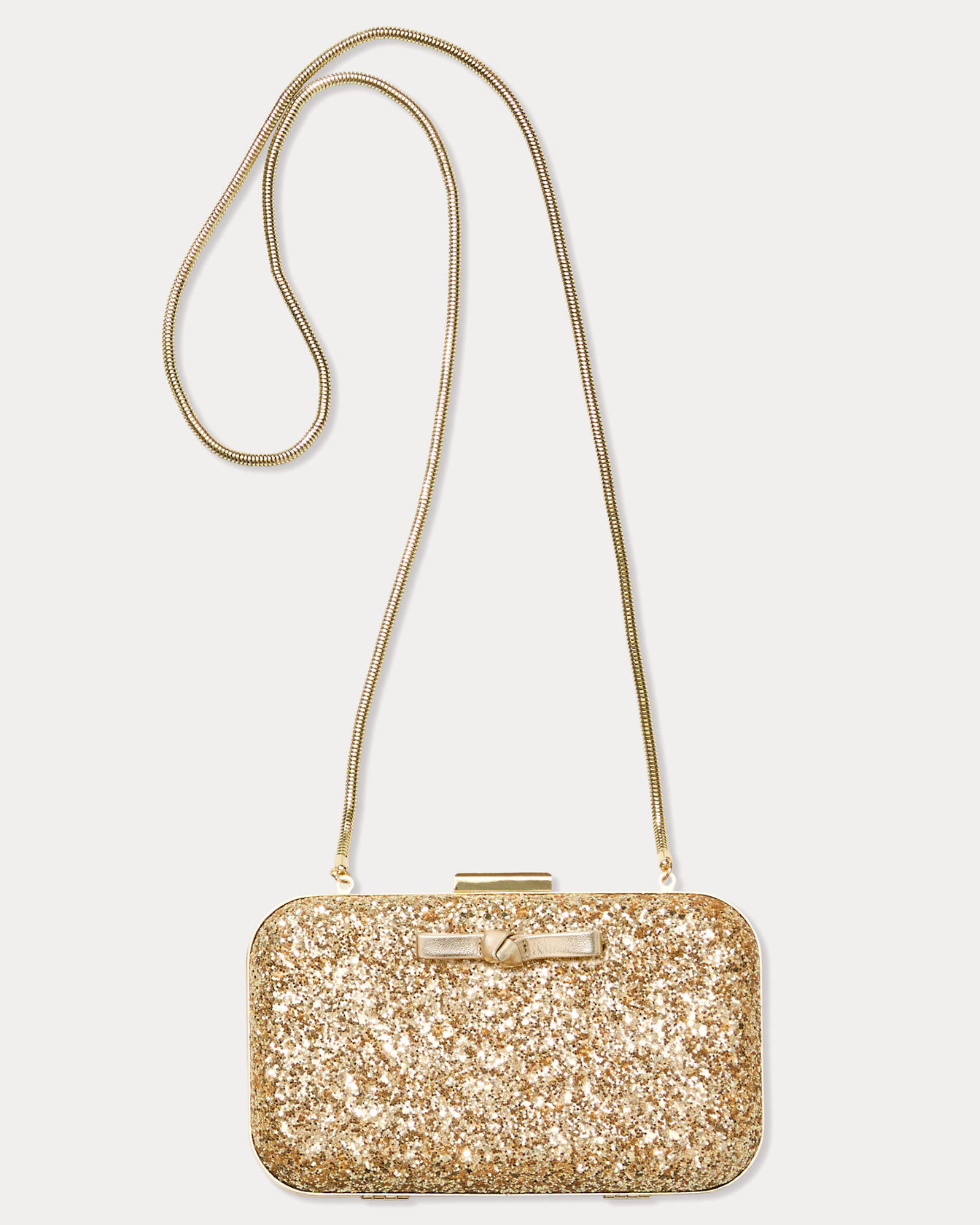 - Gold glitter hard clutch with gold metal trim, a leather bow, and a gold snake chain strap.