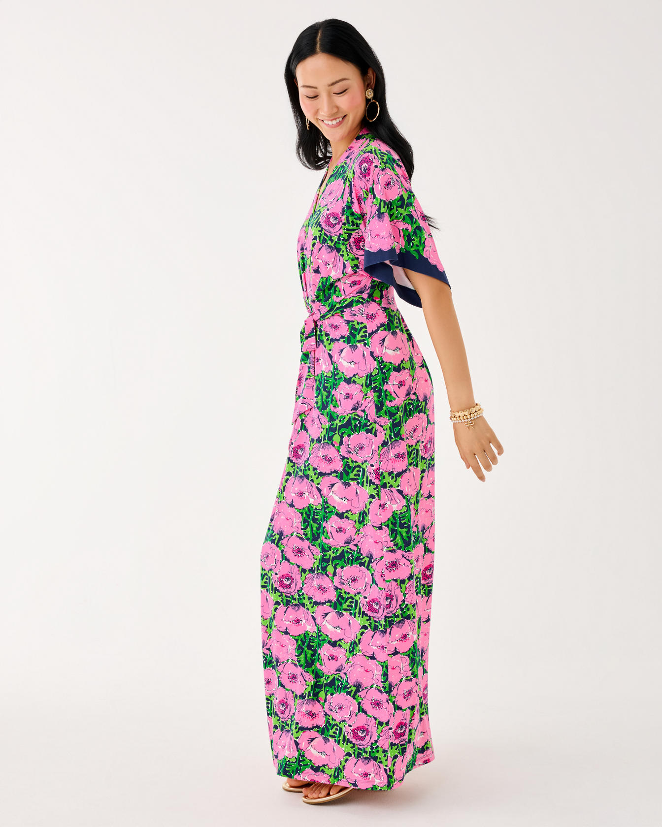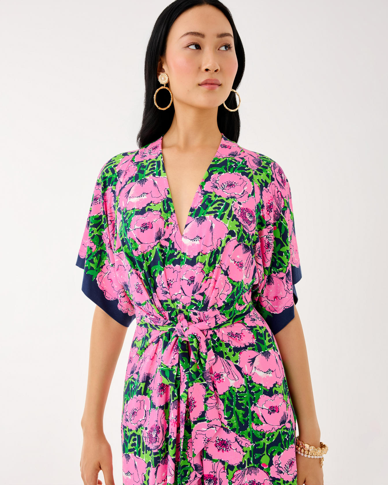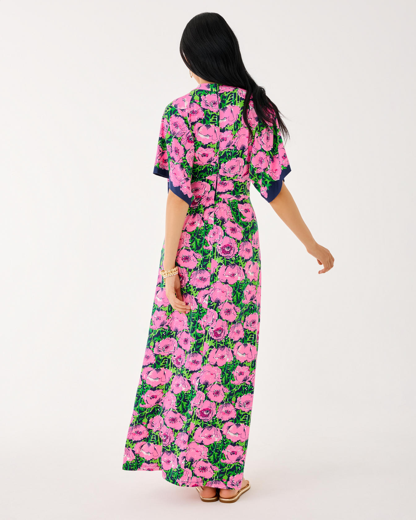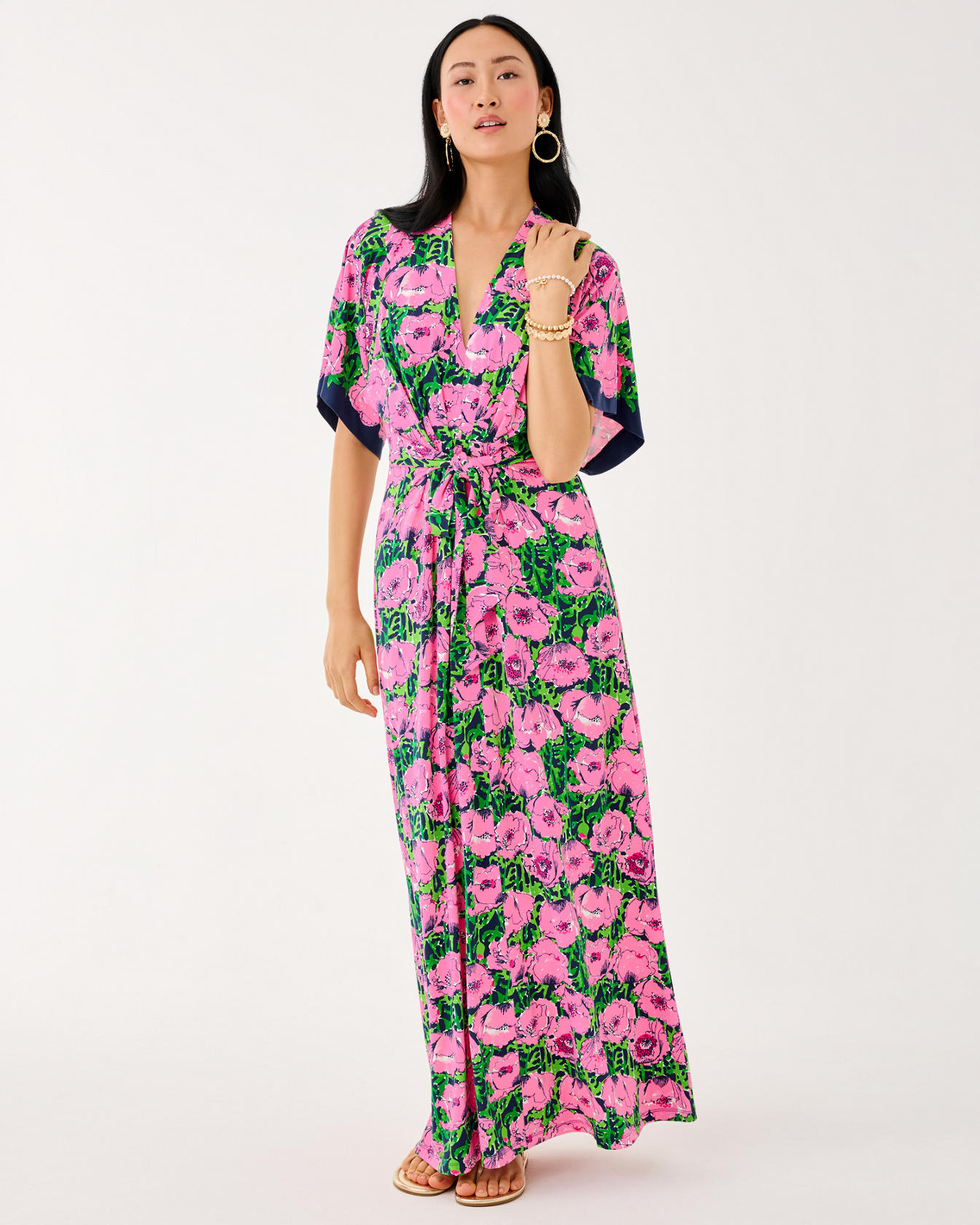 • Fit-and-flare maxi dress with a deep v-neckline, kimono sleeves, and a functional front tie detail at the waist.