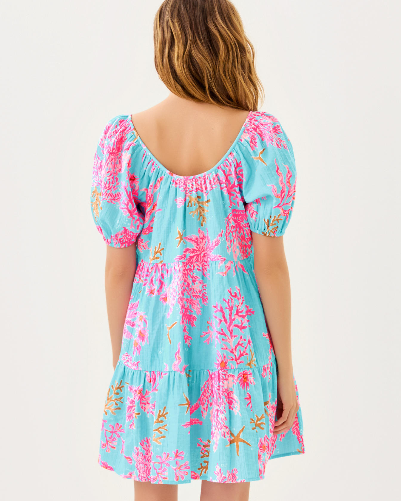 - Easy fit, mini dress with short sleeves and a tiered skirt.